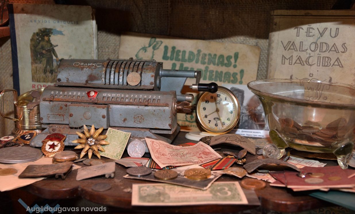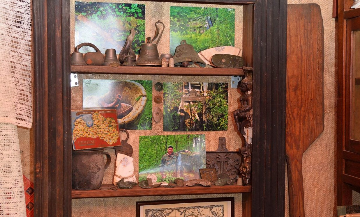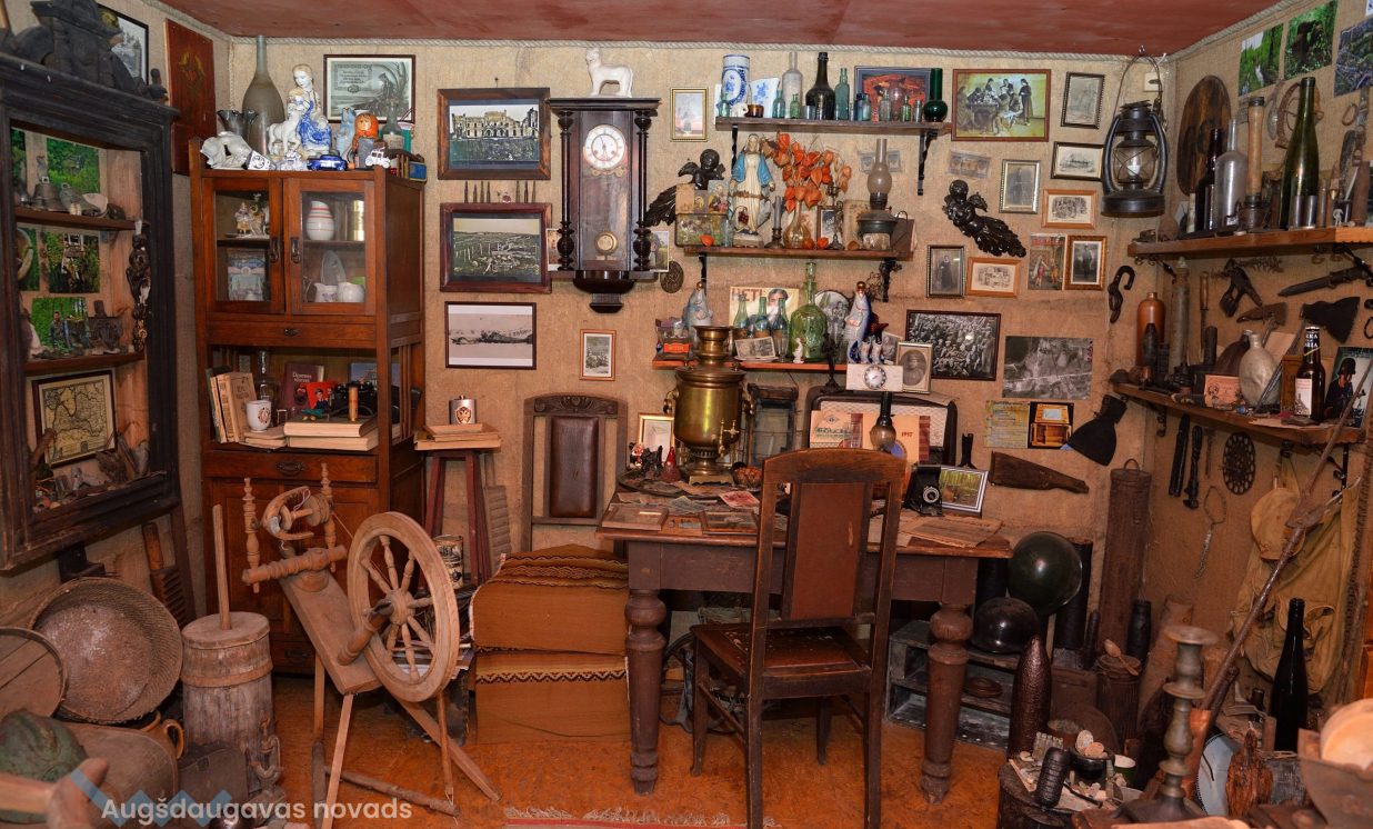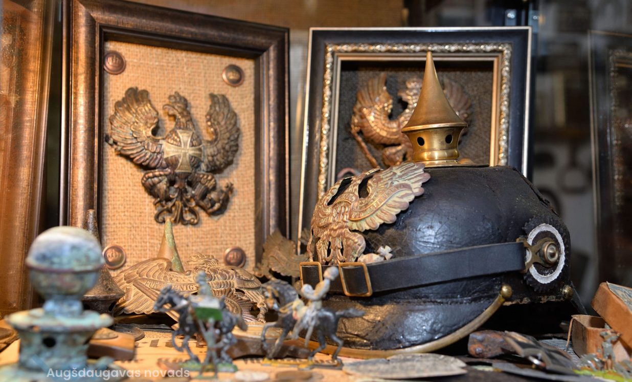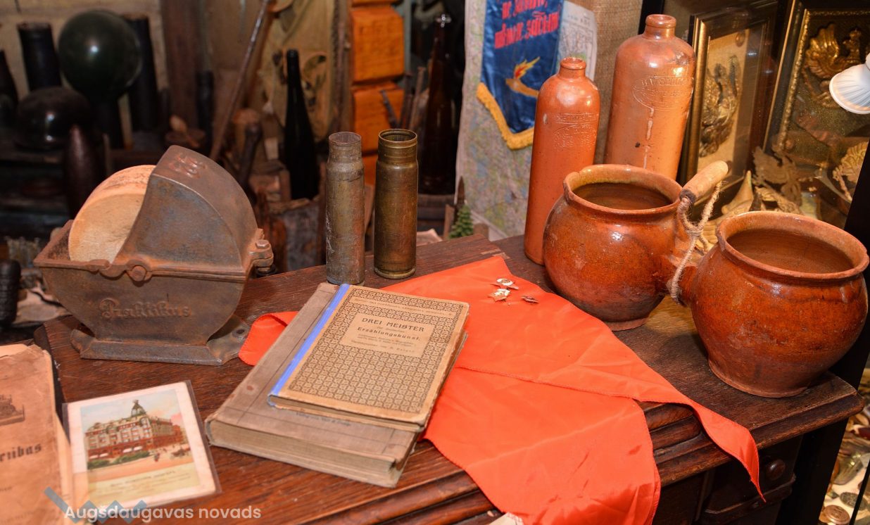 Esošā ekspozīcija nosacīti sadalīta divās daļās – vienu veido Raimonds, otru Juris. Gan vienā, gan otrā ir, ko redzēt. Eksponātus Juris nepērk un arī nepārdod. Viss ir paša un brāļa atrasts. Ekspozīcijā ir dažādi munīcijas pārpalikumi, zaldātu ikdienā lietotie priekšmeti. Juris aizrautīgi stāsta par saviem atradumiem, ar katru no tiem saistās kāds īpašs stāsts. Stikla vitrīnā redzami vairāki plēsīga putna atveidojumi metālā, tas ir Prūsijas karalistes ģerbonis, kas rotājis daudzu vācu zaldātu ķiveres. Retāki ir citu Vācijas federālo zemju, piemēram, Saksijas ģerboņi, taču Jurim izdevies atrast arī tādu. Visi eksponāti jau vairāk kā simts gadus atradušies zem sūnām vai zemes, daudzus skāris laika zobs, taču liela daļa par brīnumu labi saglabājusies, tostarp kara hospitāļa plākstera iepakojums ar visiem uzrakstiem un plāksteri. Plauktos liela stikla pudelīšu kolekcija. Daudzās kara laikā atradušies medikamenti. Juris uzgājis odekolona pudeli ar visu papīra etiķeti, uz kuras joprojām var salasīt “Kölnisch Wasser” (“Ķelnes ūdens”), tādu Vācijā ražojot līdz mūsu dienām. Greznās stikla glāzītes izrādās sinepju un džema trauciņi, ko vēlāk zaldāti izmantojuši grādīgā saliešanai.