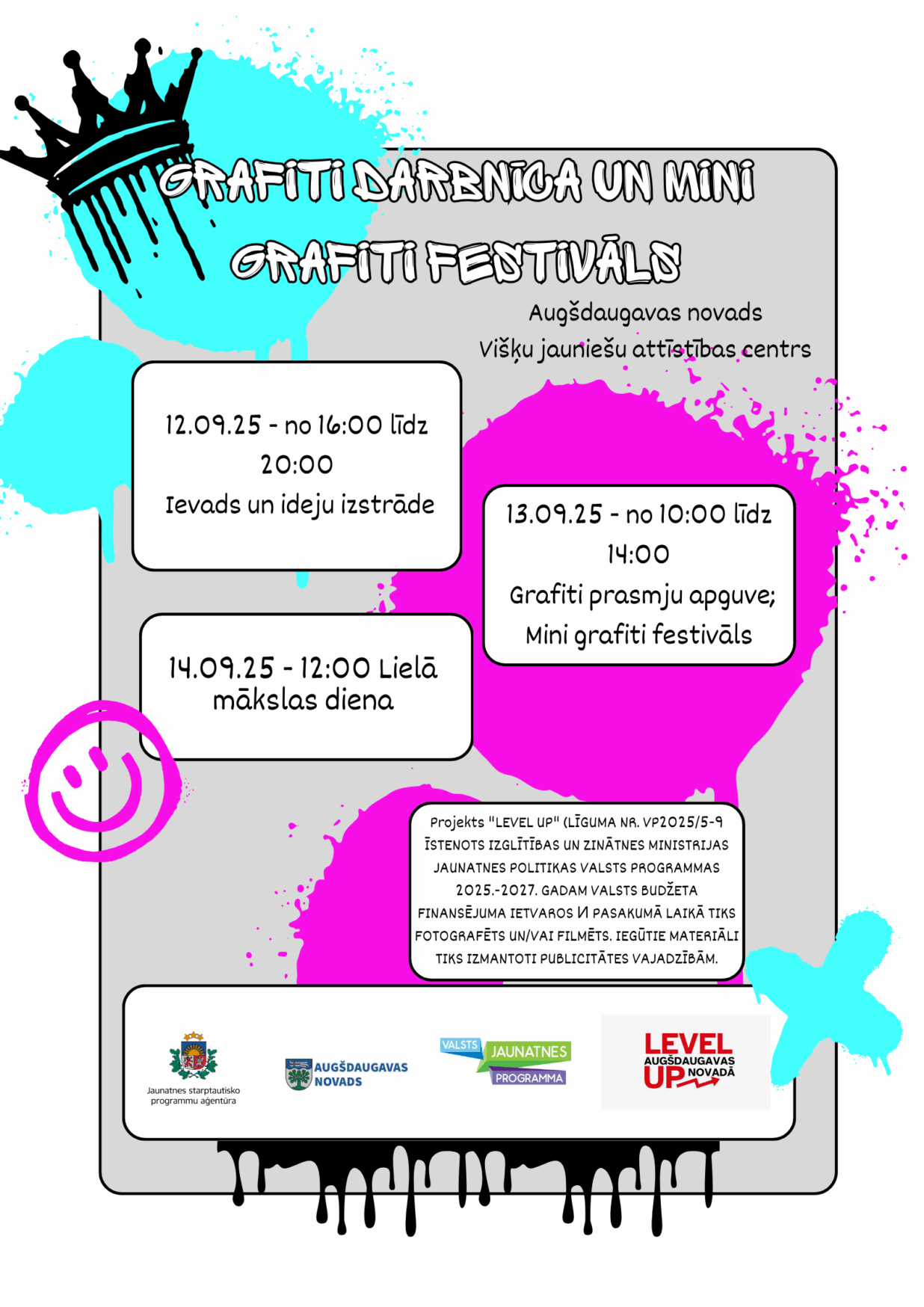 Pasākums tiek īstenots projekta “LEVEL UP” (LĪGUMA NR. VP20255-9) ietvaros ar Izglītības un zinātnes ministrijas Jaunatnes politikas valsts programmas 2025.–2027. gadam valsts budžeta finansējumu.