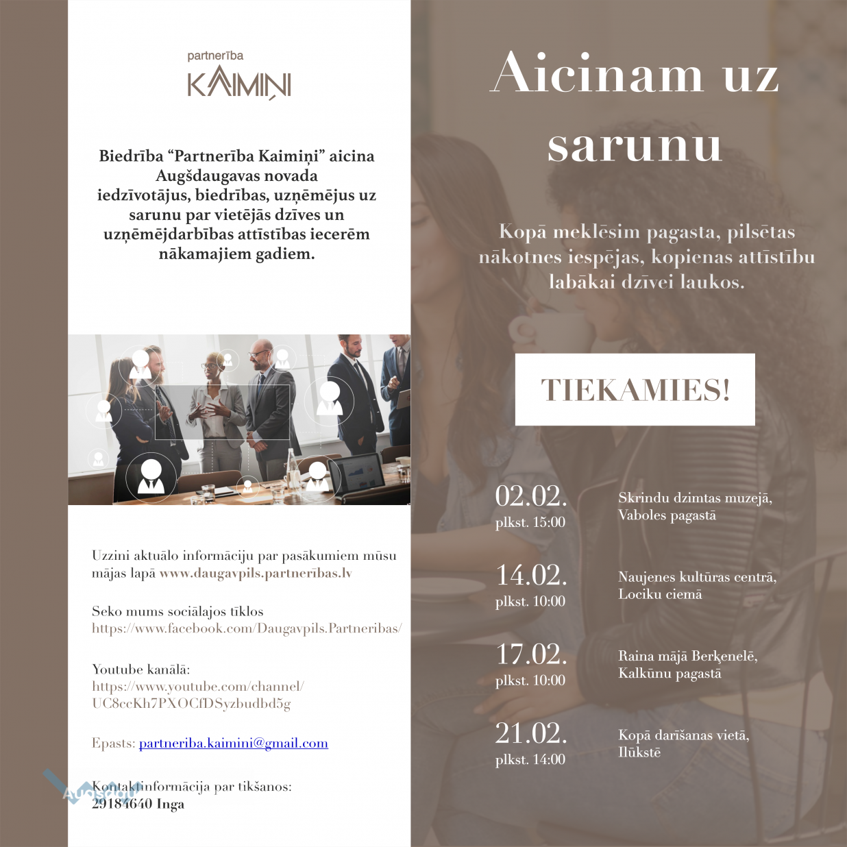 Aicinām Augšdaugavas novada iedzīvotājus, biedrības, uzņēmējus uz sarunām par vietējās dzīves un uzņēmējdarbības attīstības iecerēm.