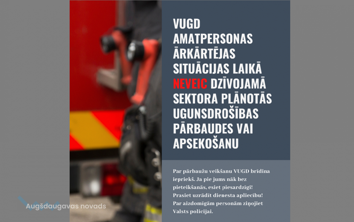 Ņemot vērā informāciju par nenoskaidrotu personu aktivitātēm, apmeklējot mājokļus un maldinot iedzīvotājus, ka pārbauda, vai ir uzstādīti dūmu detektori, Valsts ugunsdzēsības un glābšanas dienests informē, ka ārkārtējas situācijas laikā VUGD amatpersonas neveic dzīvojamā sektora plānotās ugunsdrošības pārbaudes vai apsekošanu.