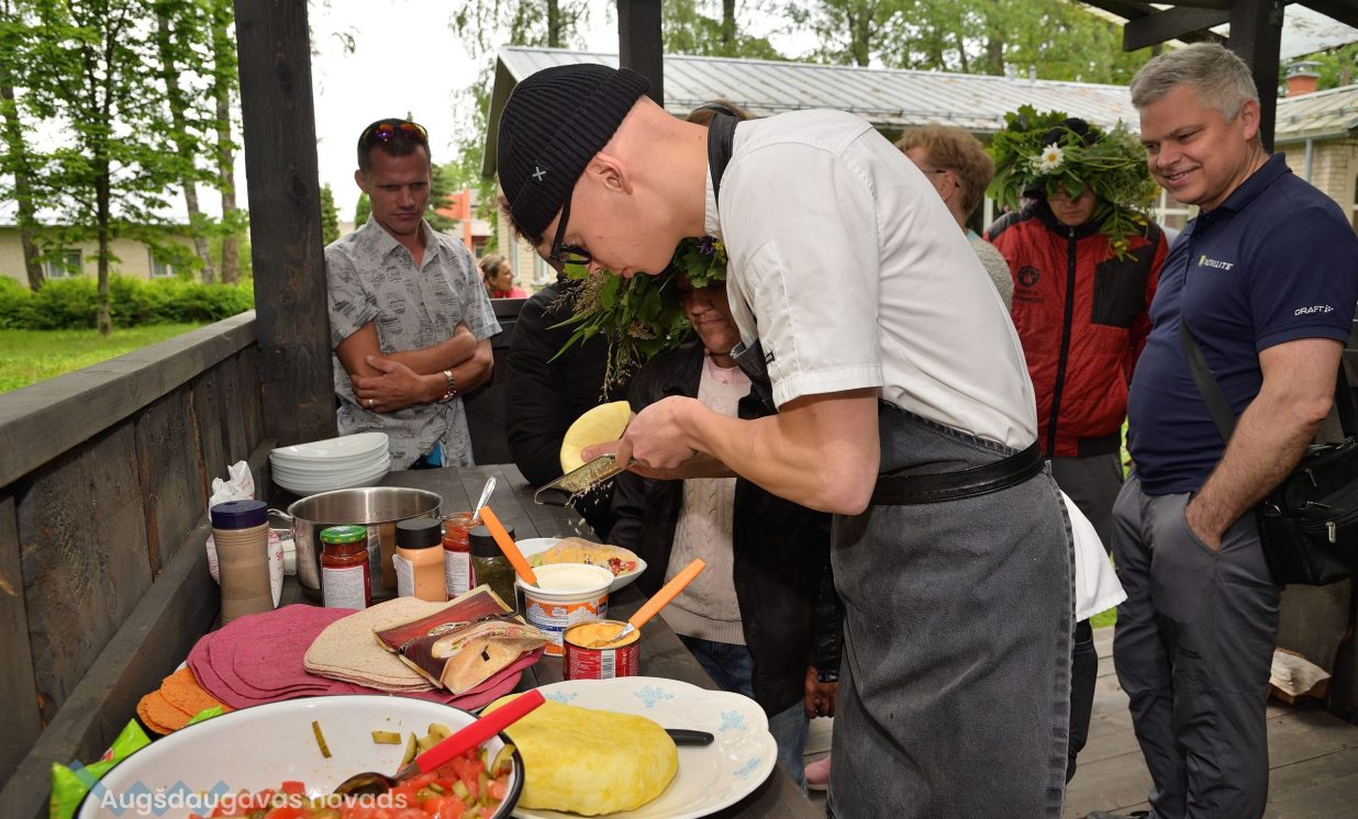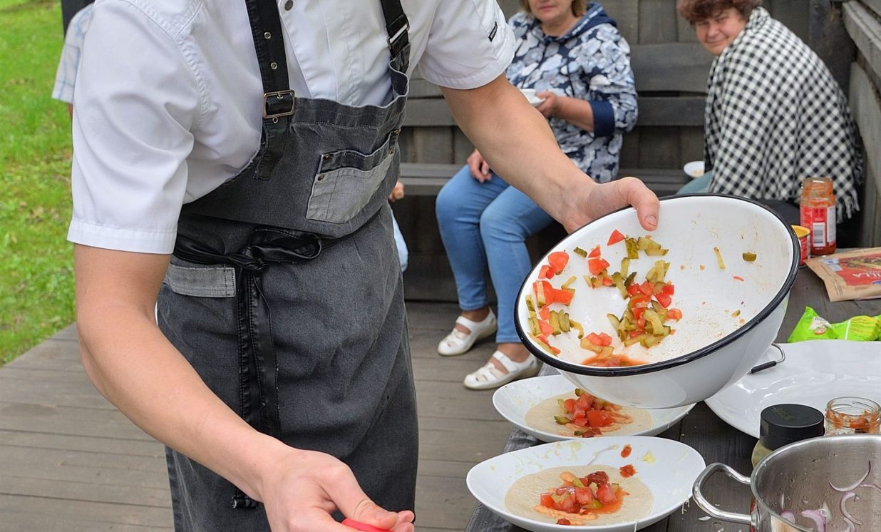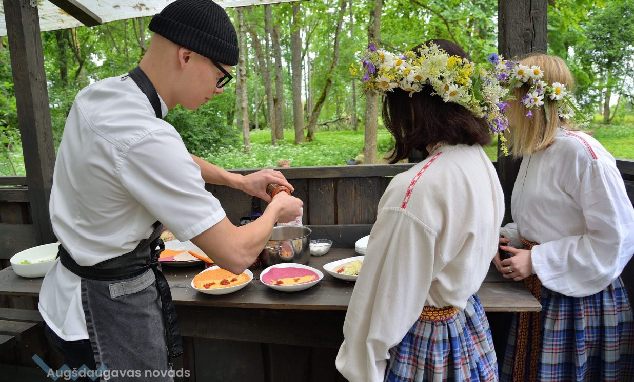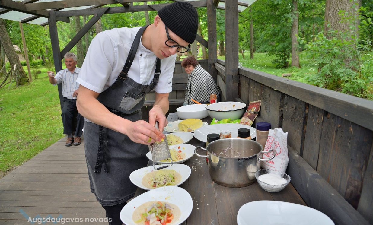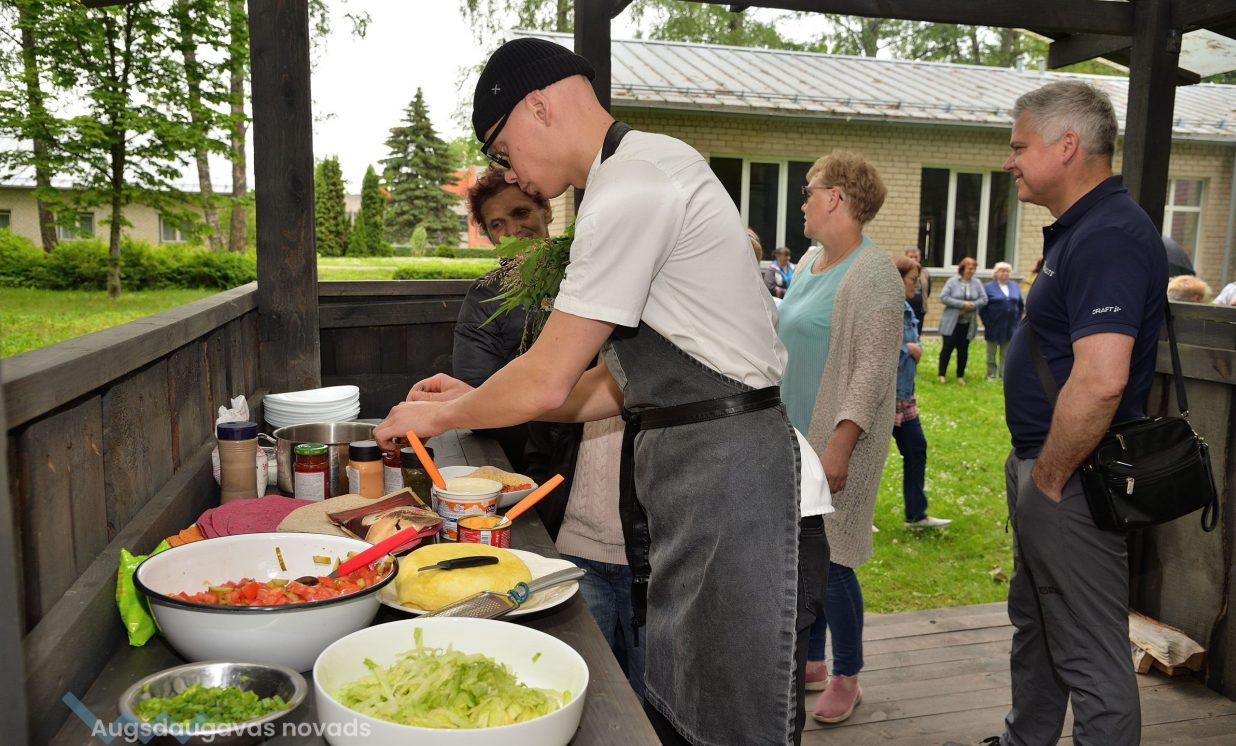Pasākuma turpinājumā viesi tika aicināti uz Skrindu dzimtas muzeja kulinārā mantojuma telpu, kur rosījās profesionāls pavārs, kalupietis Haralds Saušs, gatavojot viesiem neparastu cienastu.