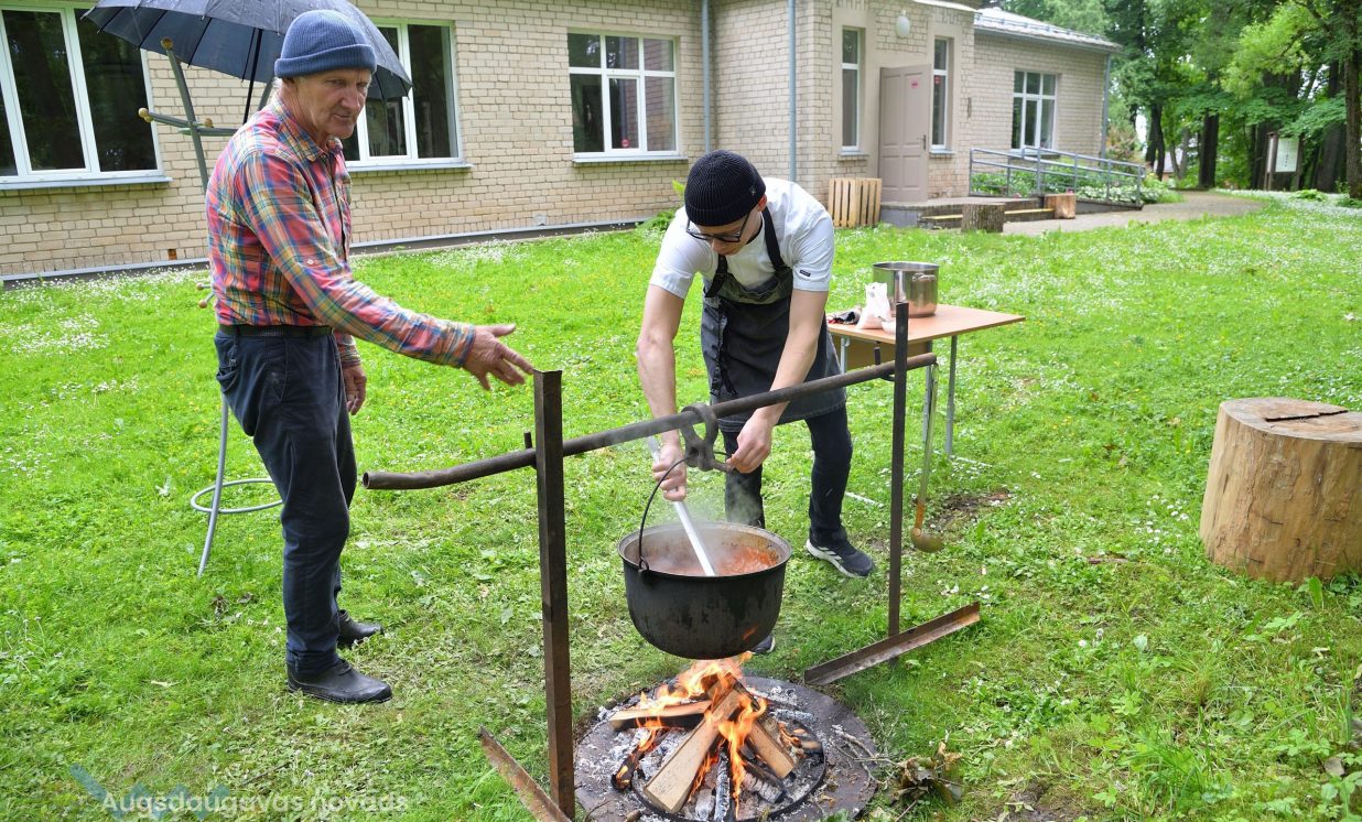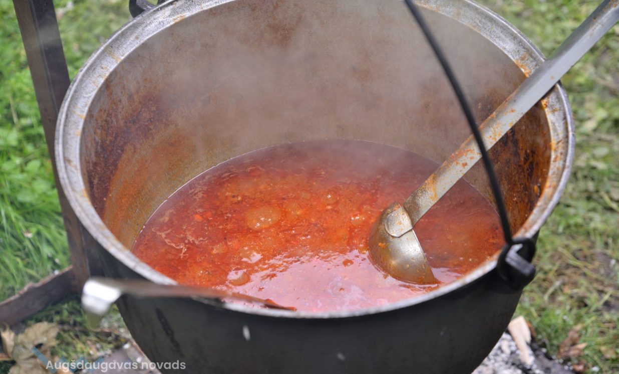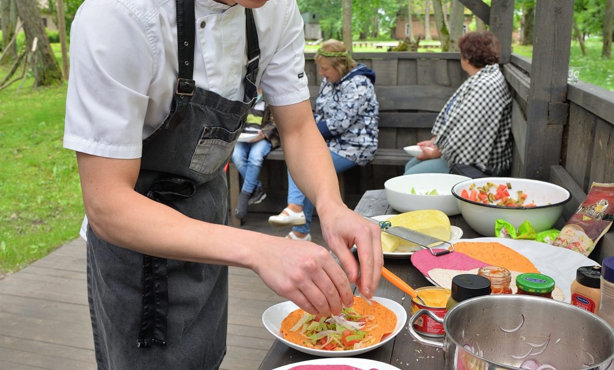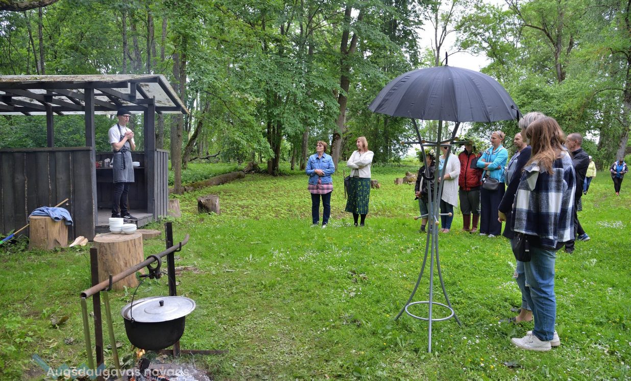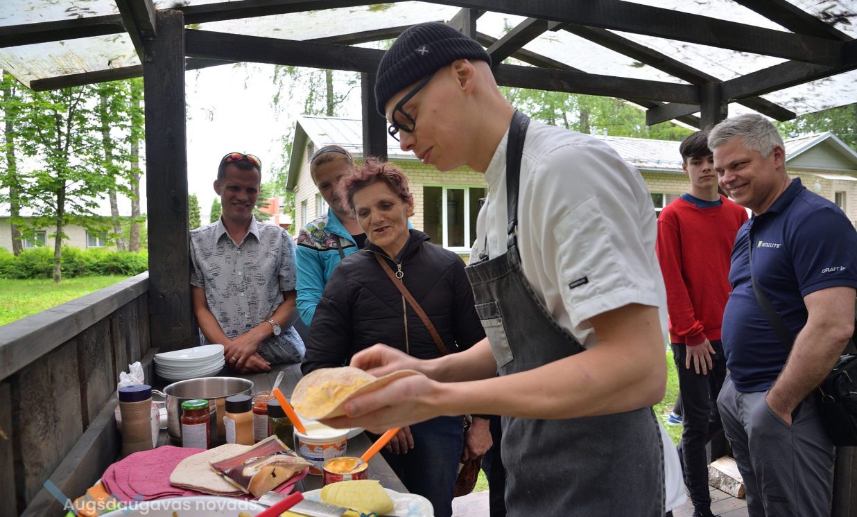 Pasākuma turpinājumā viesi tika aicināti uz Skrindu dzimtas muzeja kulinārā mantojuma telpu, kur rosījās profesionāls pavārs, kalupietis Haralds Saušs, gatavojot viesiem neparastu cienastu.
