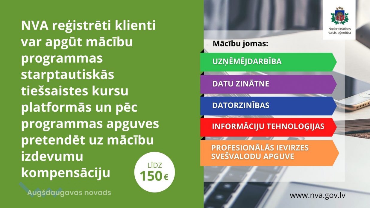 Reģistrētajiem bezdarbniekiem un reģistrētajiem darba meklētājiem, kuriem ir nepieciešams apgūt vai pilnveidot profesionālās zināšanas un prasmes, Nodarbinātības valsts aģentūra (NVA) piedāvā iespēju mācīties atvērto tiešsaistes kursu platformās un saņemt mācību izdevumu kompensāciju līdz 150 eiro apmērā.