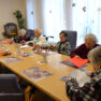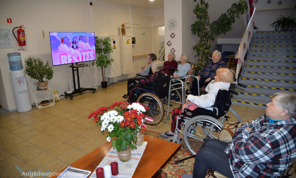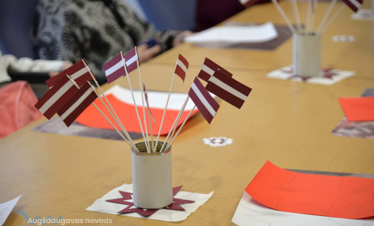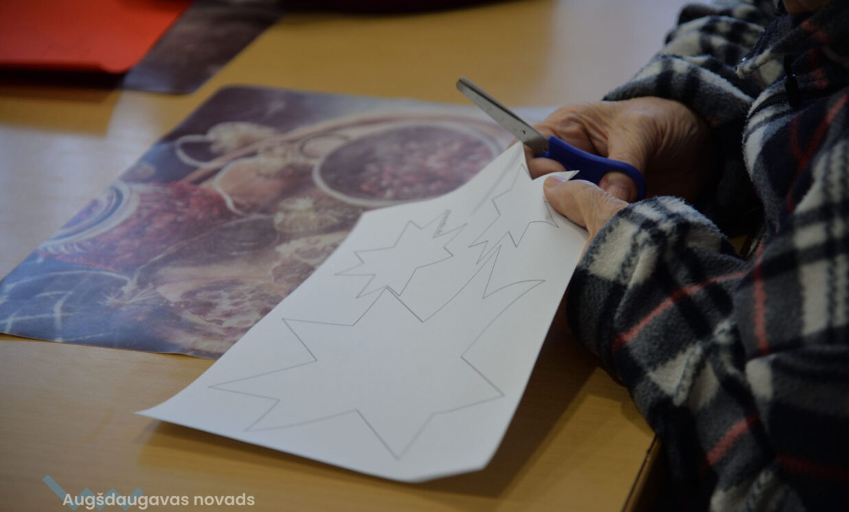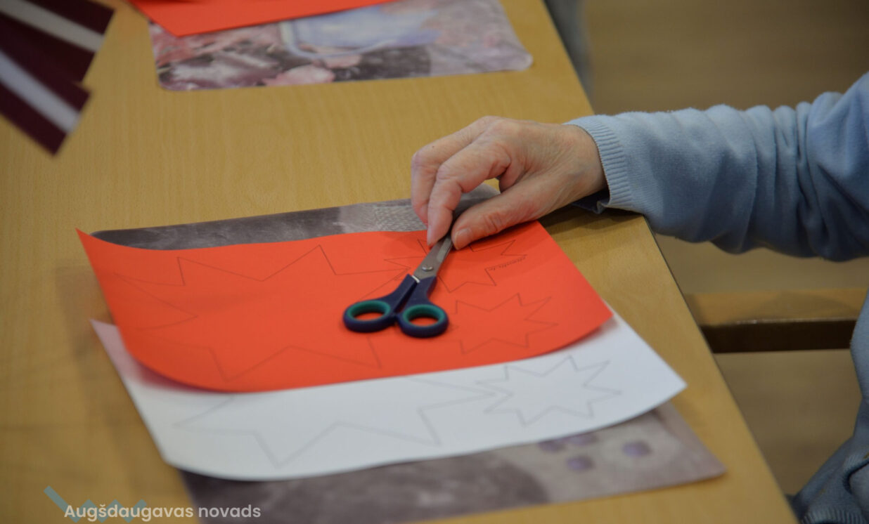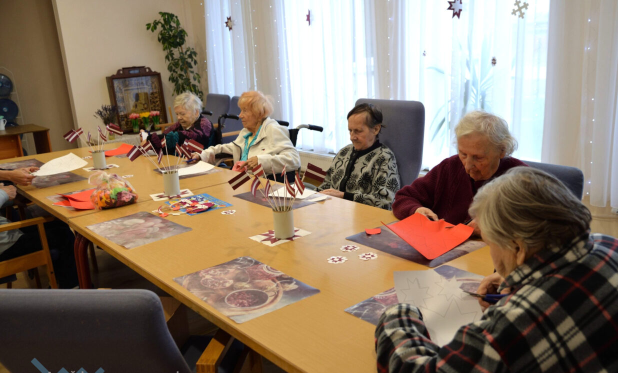 Pirms Valsts svētkiem “Senioru Rezidences” iemītnieki pulcējās zālē, lai piedalītos ikdienas nodarbībā ar sociālo rehabilitoloģi Ludmilu Gladiševu. Šoreiz bija tēma – svētku dekora izgatavošana. Seniori izgriež no krāsaina papīra Latvijas simbolus un veido skaistas kompozīcijas, kuras var, piemēram, piespraust pie apģērba vai izveidot no tiem atklātnes. No malas var šķist, ka tas ir viegli, tomēr tā nav – dažiem ir ļoti grūti pat noturēt rokās šķēres, citiem ir slikta redze, bet seniori ļoti cenšas, jo vajag saglabāt un attīstīt sīkās motorikas pamatus.