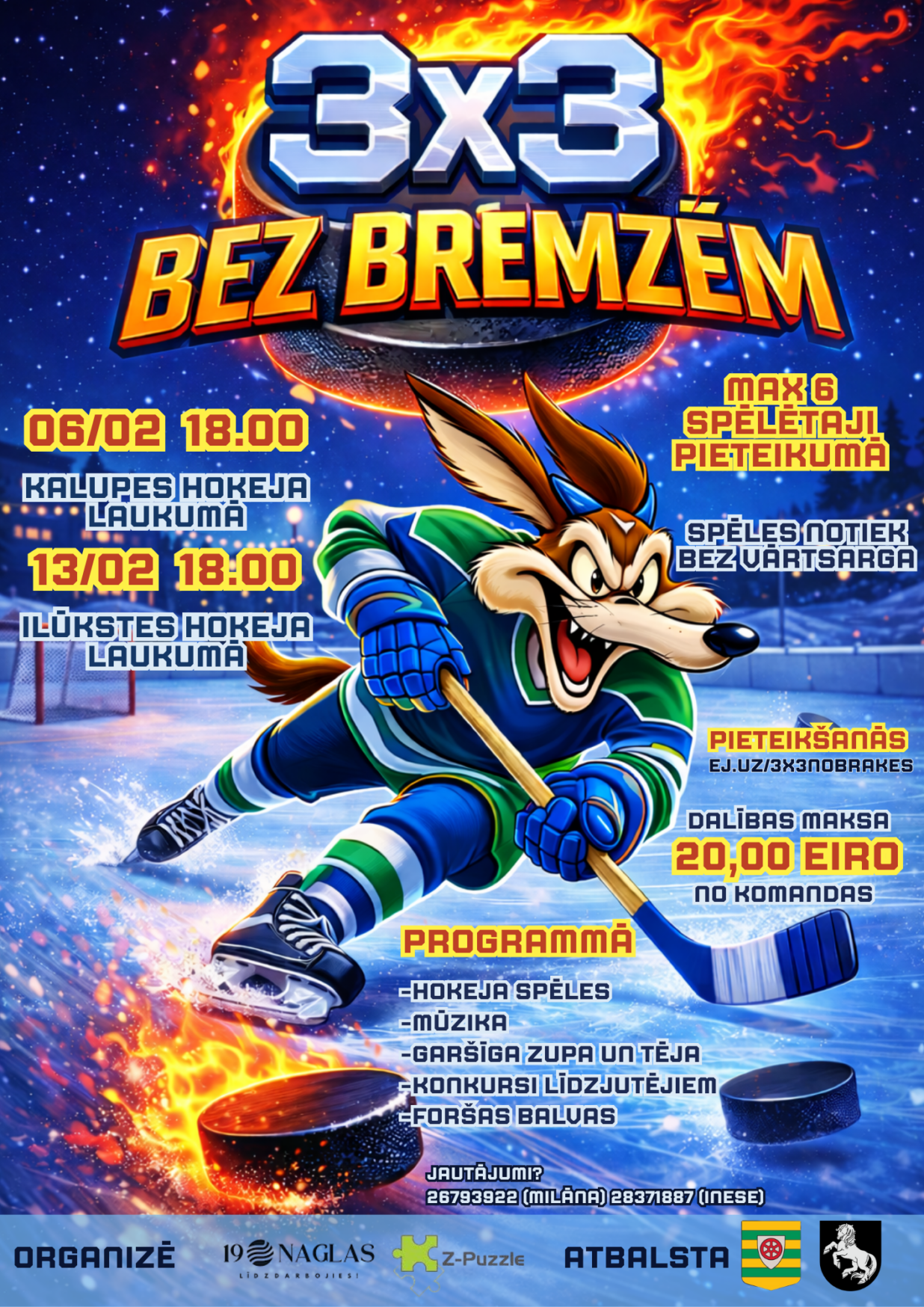 Kamēr šī gada ziema mūs lutina ar piemērotiem laikapstākļiem ziemas sporta aktivitātēm, iedzīvotāji un viesi aicināti piedalīties un apmeklēt 3x3 hokeja turnīru “Bez bremzēm”, kas februārī norisināsies divos novada hokeja laukumos.