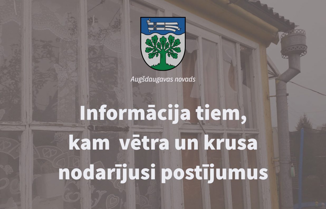 Augšdaugavas novada pašvaldības iedzīvotāji aicināti līdz 16. augusta plkst. 12.00 vērsties pašvaldībā ar iesniegumu vētras radīto seku apzināšanai un zaudējumu novērtēšanai. Iesniegumus var sūtīt elektroniski ar elektronisko parakstu uz savu pagastu (e-pasta adreses skatīt sadaļā Pagasti) vai pašvaldības centrālo administrāciju: pasts@augsdaugavasnovads.lv, kā arī var iesniegt klātienē pagastā vai pašvaldības centrālajā administrācijā Daugavpilī, Rīgas ielā 2, 1. stāva foajē pie konsultanta, tālrunis uzziņām 654 22 238.