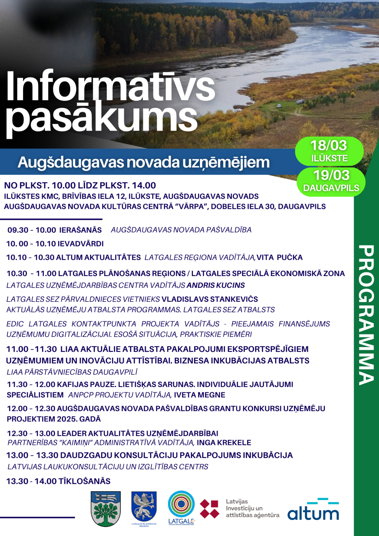 Š.g. 18. un 19. martā Augšdaugavas novadā norisināsies informatīvi pasākumi uzņēmējiem, kuros būs iespēja uzzināt par dažādiem atbalsta mehānismiem, finansējuma iespējām un aktuālajām uzņēmējdarbības attīstības programmām.