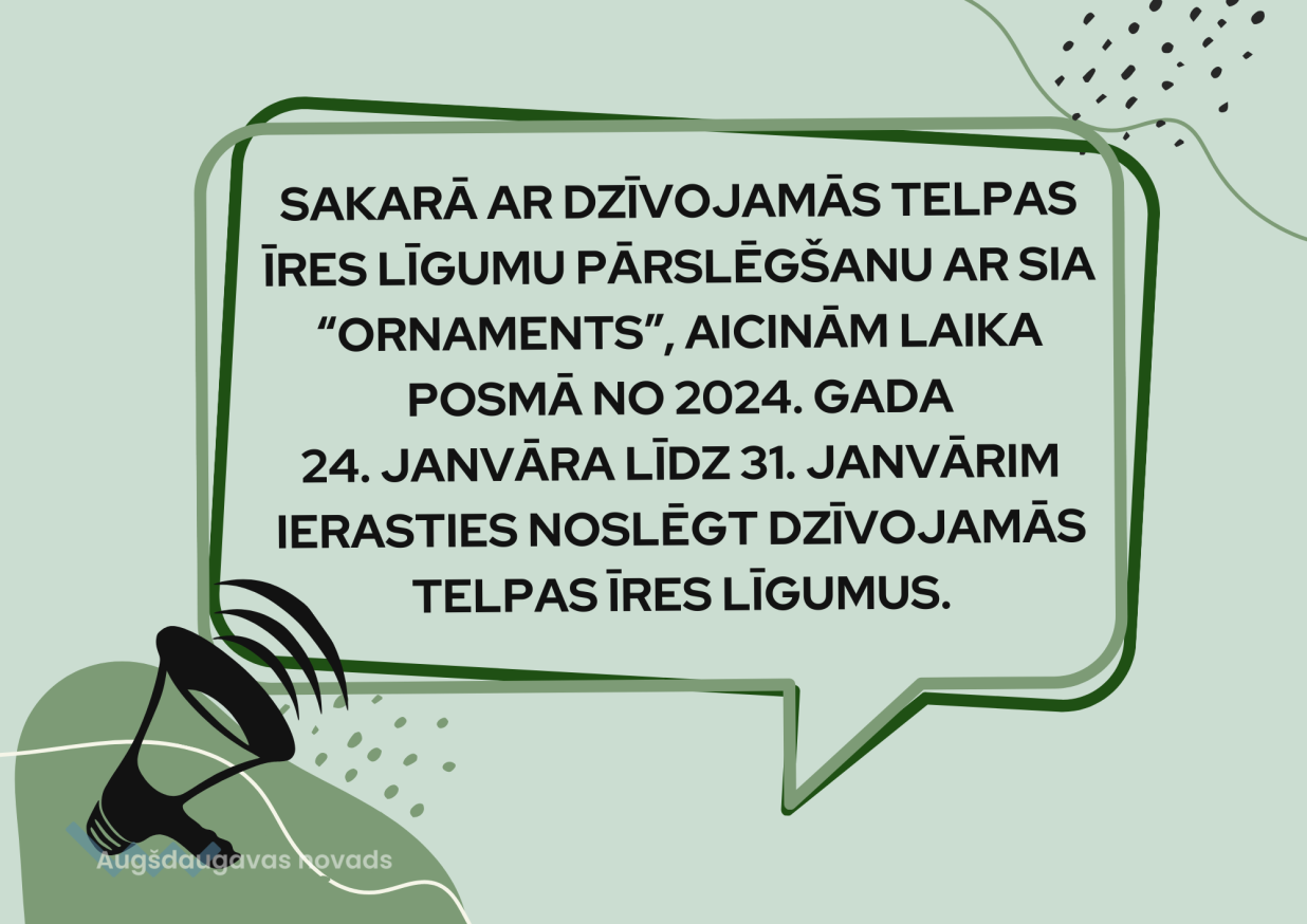 Pamatojoties uz 13.12.2023. Augšdaugavas novada pašvaldības Dzīvokļa jautājumu komisijas lēmumiem “Par dzīvojamās telpas īres līguma grozīšanu sakarā ar īres līguma termiņa noteikšanu” un sakarā ar dzīvojamās telpas īres līgumu pārslēgšanu ar SIA “ORNAMENTS” aicinām Jūs laika posmā no 2024. gada 24. janvāra līdz 2024. gada 31. janvārim ierasties noslēgt Dzīvojamās telpas īres līgumus.