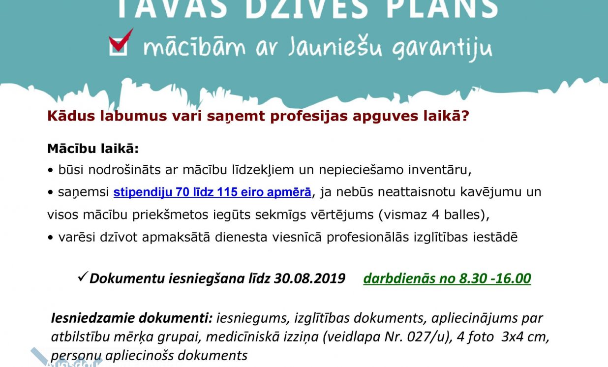 Tiek uzņemti jaunieši ar vidusskolas izglītību no 17 līdz 29 gadiem divās Jauniešu garantijas programmās. Programmā “Lauksaimniecības tehnika” ar kvalifikāciju lauksaimniecības tehnikas mehāniķis. Programmā tiek sagatavoti lauksaimniecības tehnikas mehāniķi, kuri var strādāt lauksaimniecības tehnikas servisa uzņēmumos. Mācību laikā tiek iegūta arī TR 2 traktortehnikas vadīšanas apliecība. Mācības ir bez maksas. Otrā programma “Augkopība” ar kvalifikāciju “augkopības tehniķis”. Mācību laikā tiek iegūta arī TR 2 traktortehnikas vadīšanas apliecība un augu aizsardzības līdzekļu lietošanas apliecība. Tā ir vienreizēja iespēja apgūt darba tirgū pieprasītu profesiju vien pusotra gada laikā. Mācības bez maksas.