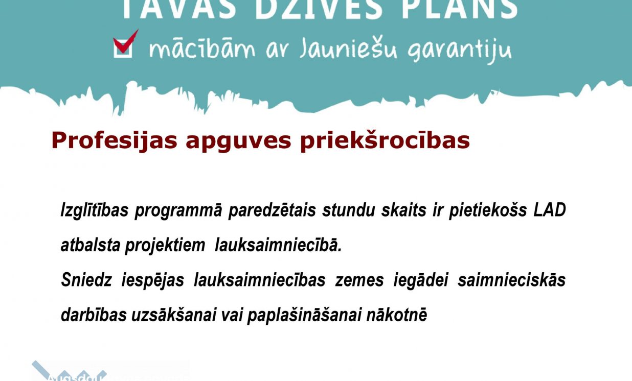 Profesijas apguves priekšrocības – izglītības programmā paredzētais stundu skaits ir pietiekošs LAD atbalsta projektiem lauksaimniecībā, kā arī sniedz iespējas lauksaimniecības zemes iegādei saimnieciskās darbības uzsākšanai vai paplašināšanai nākotnē.