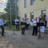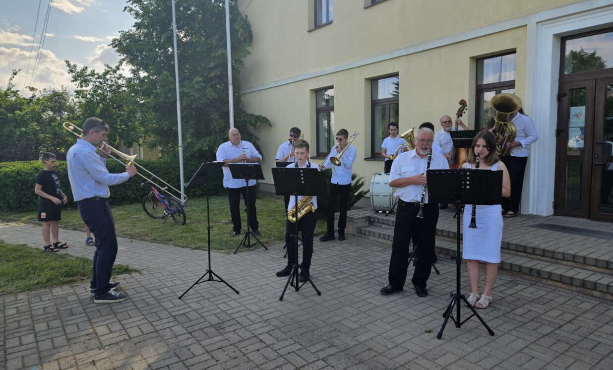 Absolventus un viesus pie skolas ar muzikālo priekšnesumu sagaidīja Naujenes Mūzikas un mākslas skolas pūšamo instrumentu orķestris, kura vadītājs ir Marats Zaletilo.