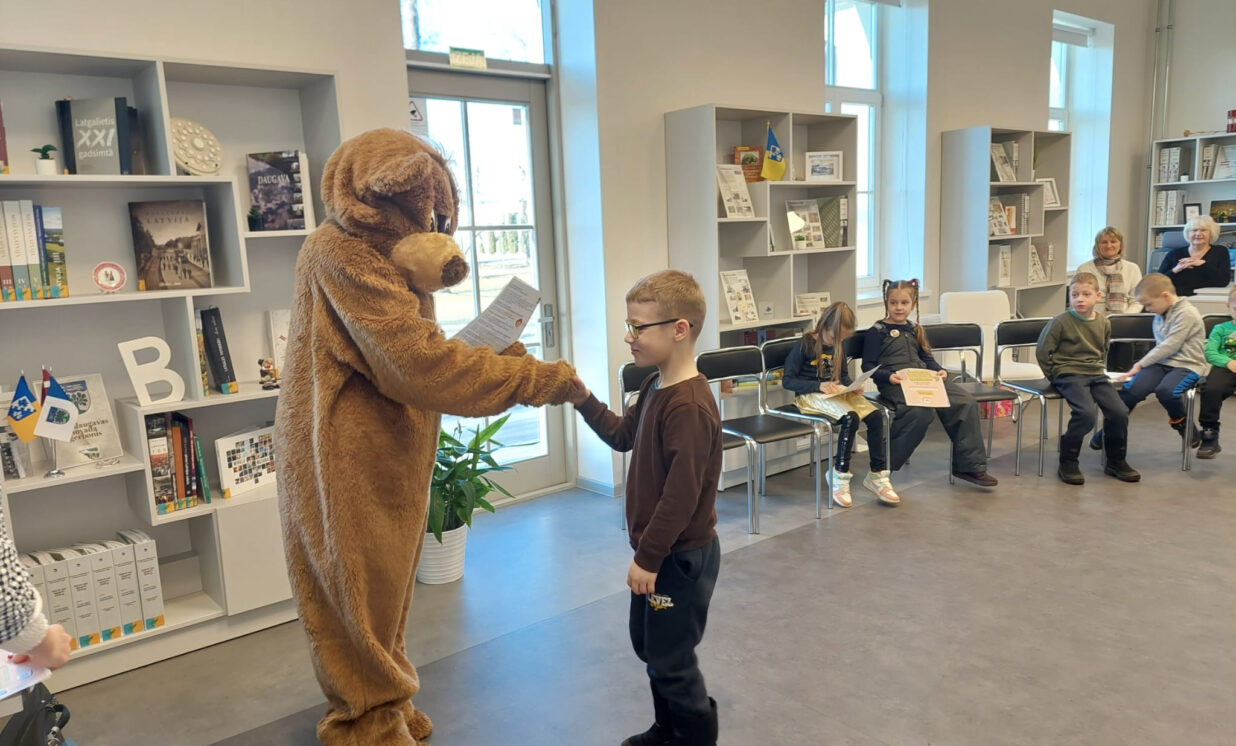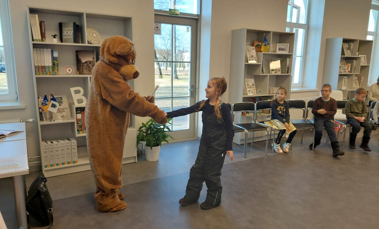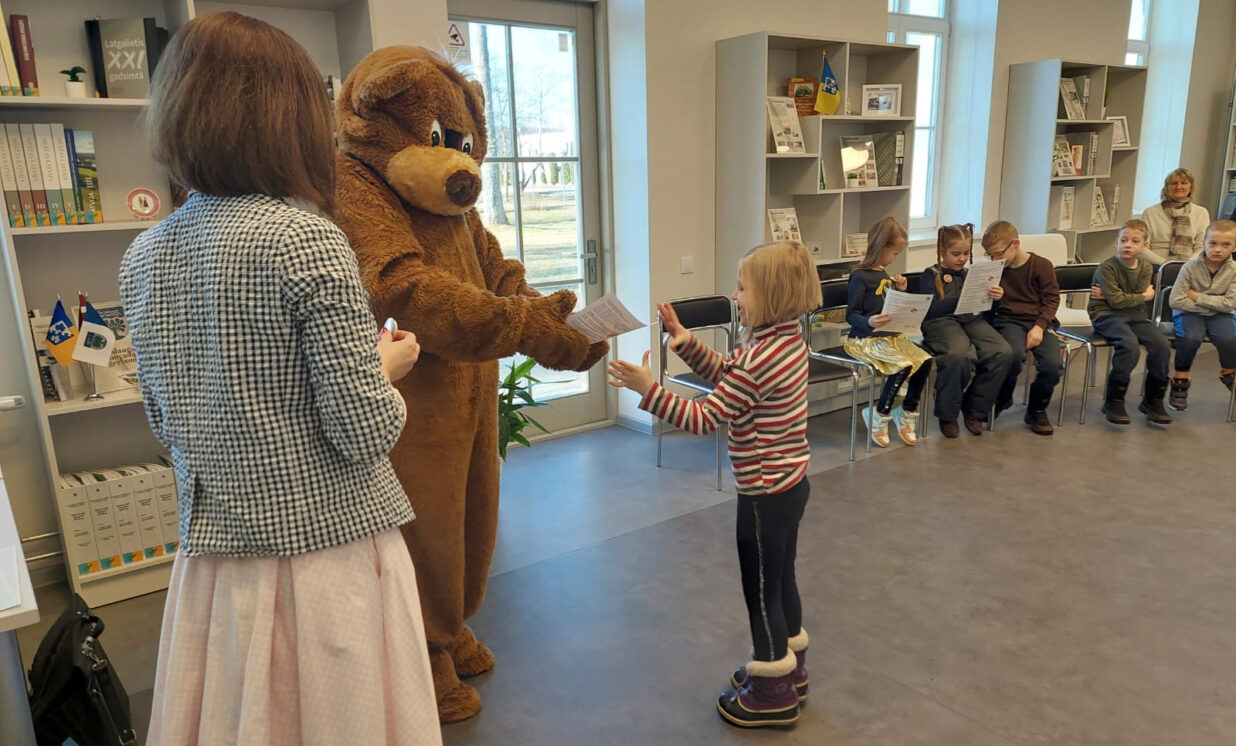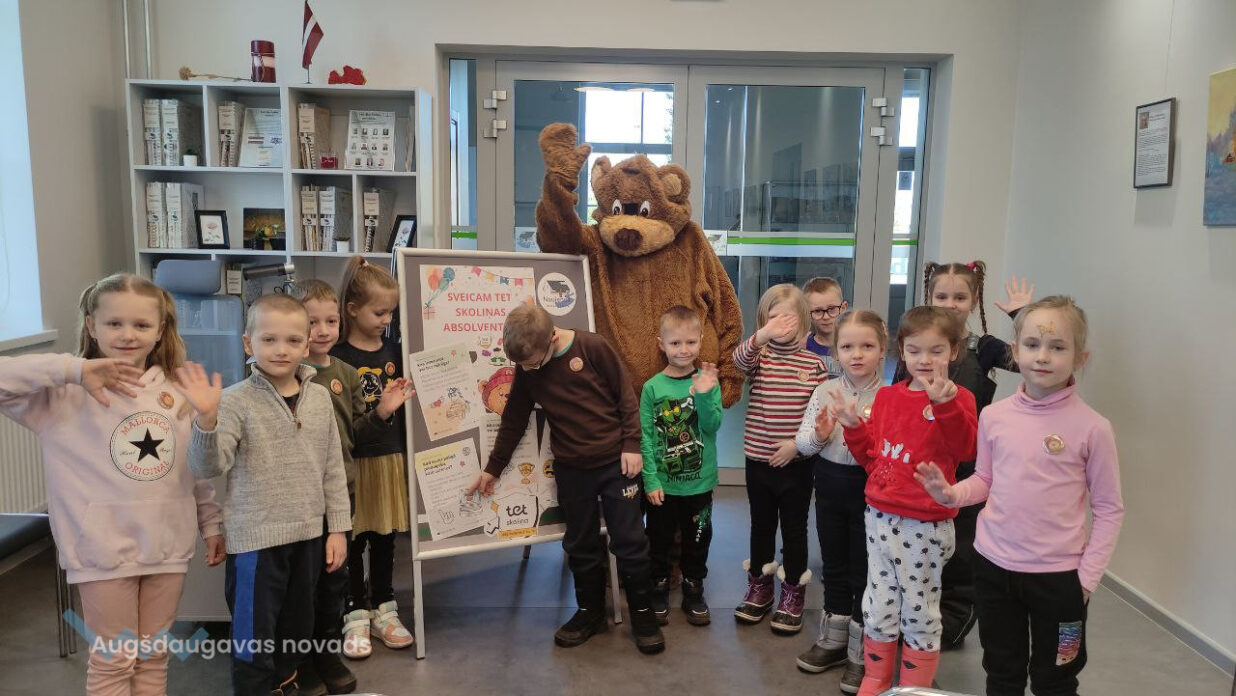 Izlaidums pagāja pārsteigumu un dāvanu pilns, jo uz Naujenes bibliotēku apsveikt absolventus atnāca... Lācis Naujēns! Izlīdis no ziemas migas viņš atnesa apsveikumu no sava drauga Ričija Rū - lielajā vēstulē bija diplomi bērniem un metodiskais materiāls skolotājām!