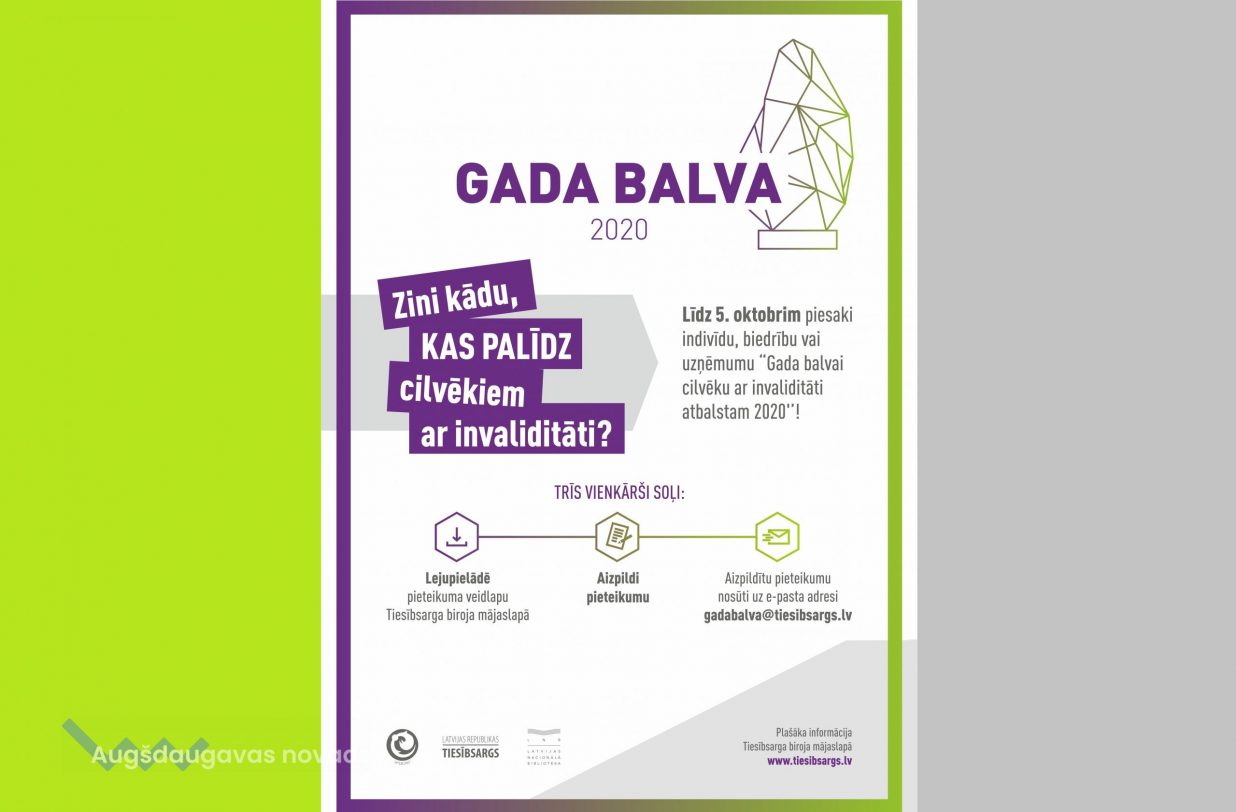Jau sesto gadu tiesībsargs kopā ar Invaldīdu un viņu draugu apvienību “Apeirons” un Latvijas Nacionālo bibliotēku aicina pieteikt cilvēkus un nevalstiskās organizācijas konkursam “Gada balva cilvēku ar invaliditāti atbalstam”. Gada balvas mērķis ir apbalvot un izcelt tos cilvēkus un organizācijas, kas ar savu ieguldījumu ikdienā iesaistās un pastāv par cilvēku ar invaliditāti tiesībām dzīvot pilnvērtīgu dzīvi.