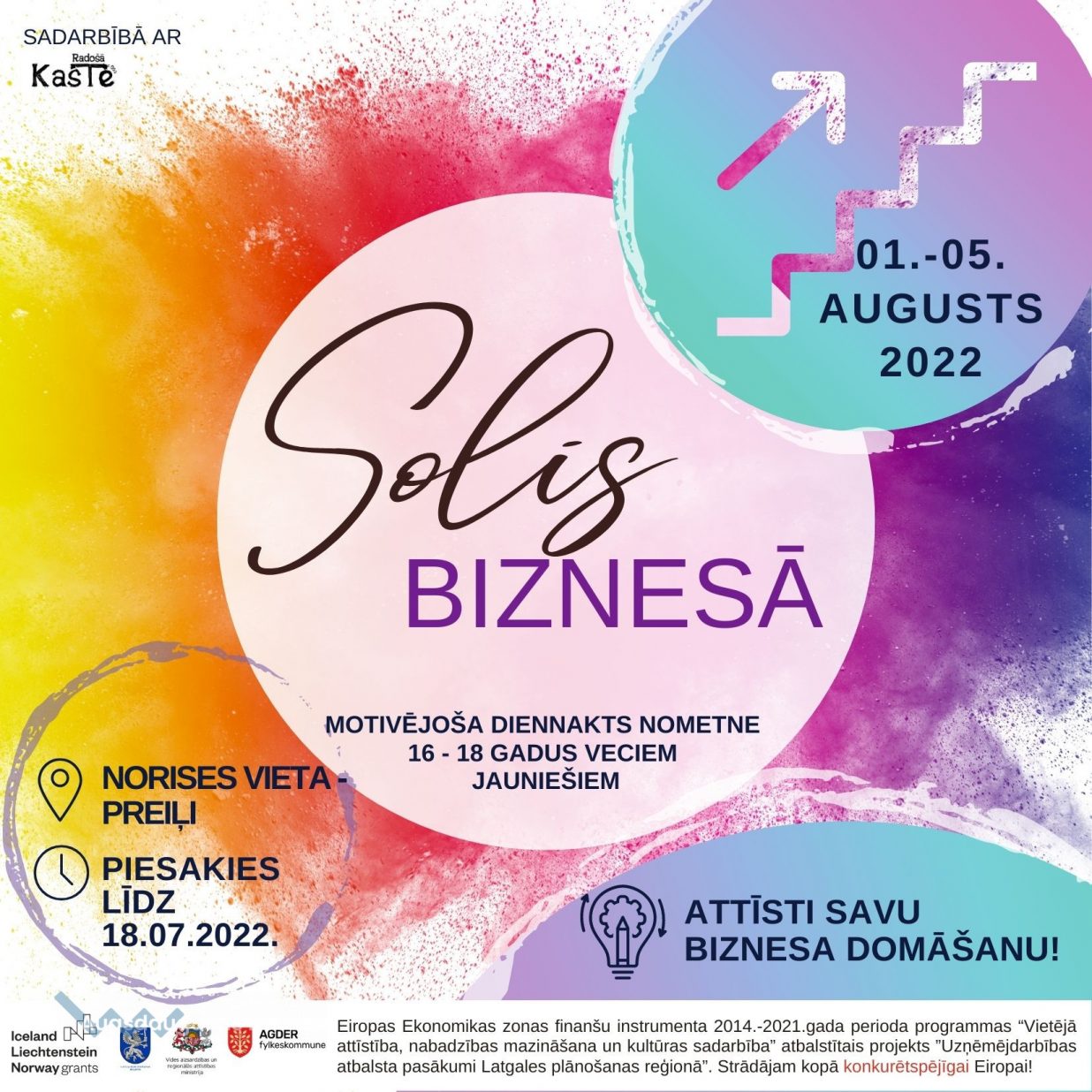 Nometne tiek rīkota Eiropas Ekonomikas zonas finanšu instrumenta 2014.-2021.gada perioda programmas “Vietējā attīstība, nabadzības mazināšana un kultūras sadarbība” atbalstītā projekta ”Uzņēmējdarbības atbalsta pasākumi Latgales plānošanas reģionā” ietvaros.
