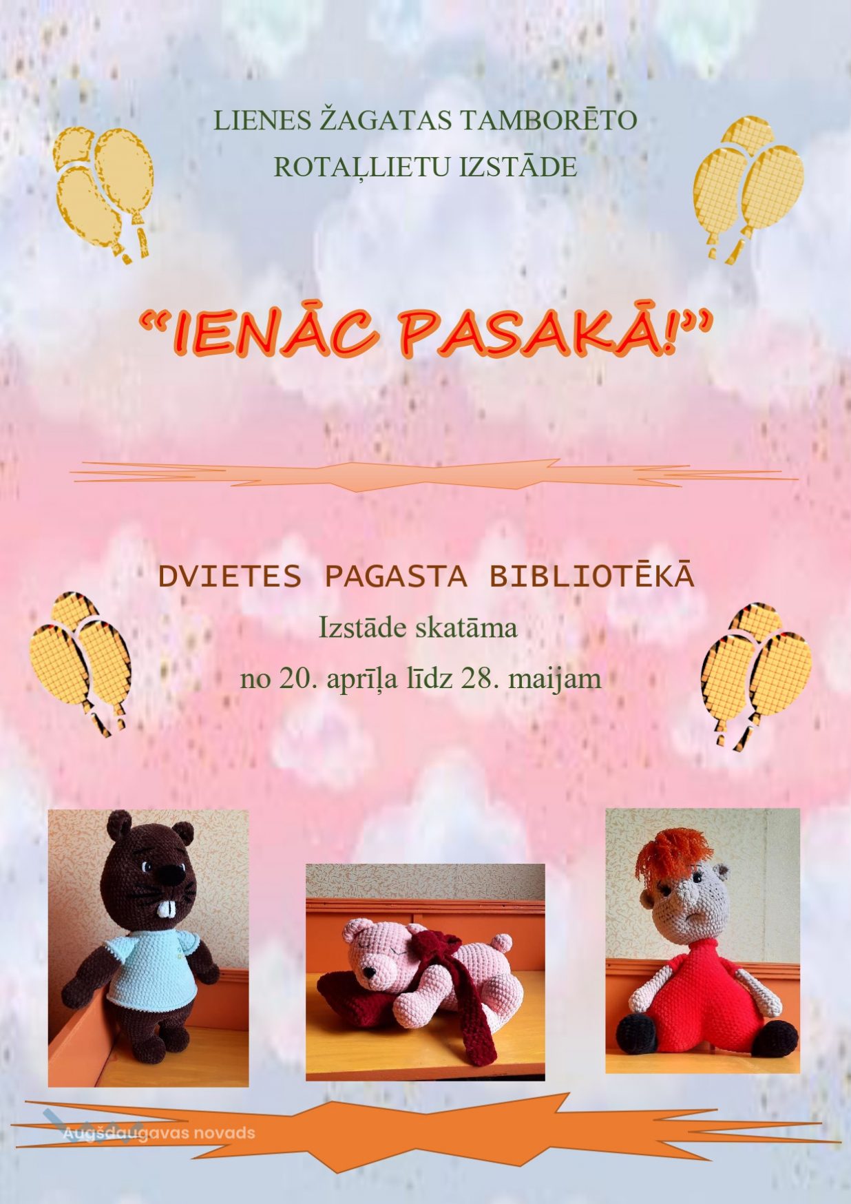 Dvietes pagasta bibliotēkā no 20. aprīļa līdz 28. maijam skatāmas bebrenietes Lienes Žagatas tamborētās rotaļlietas.