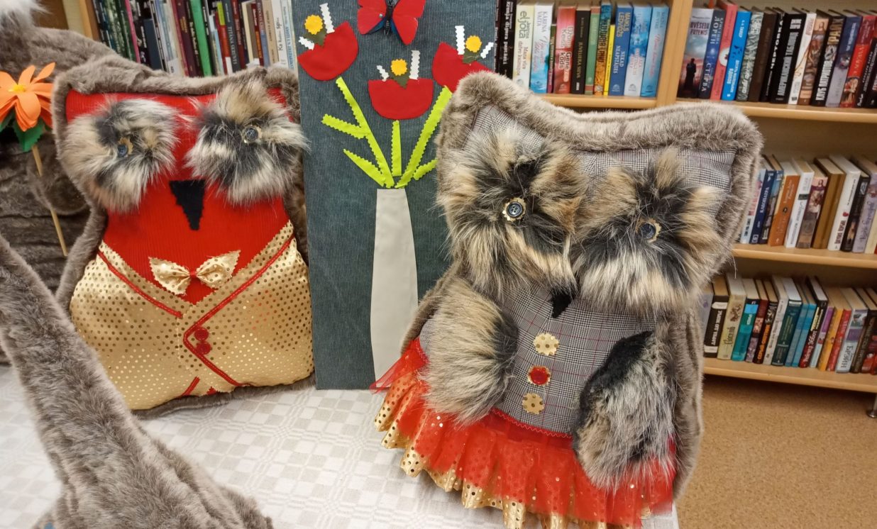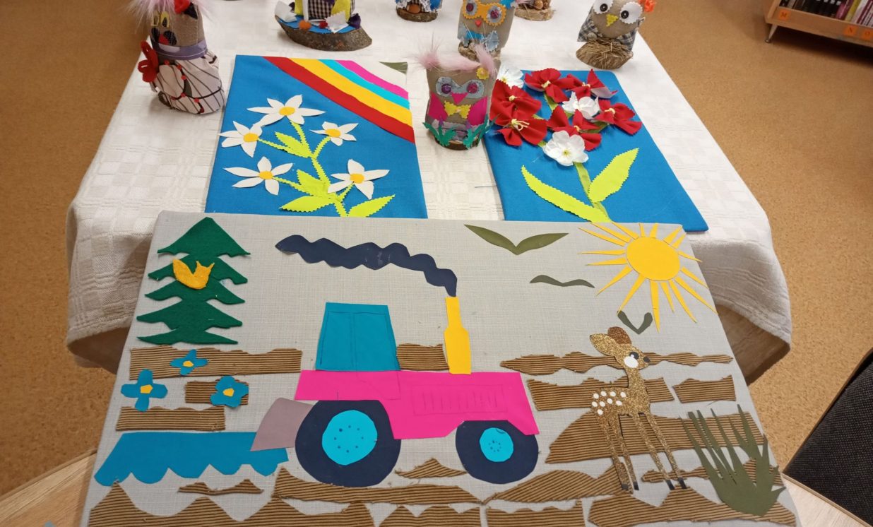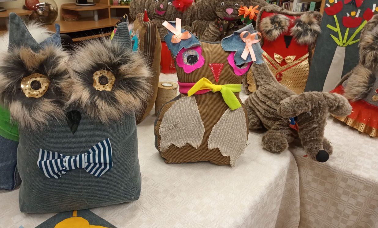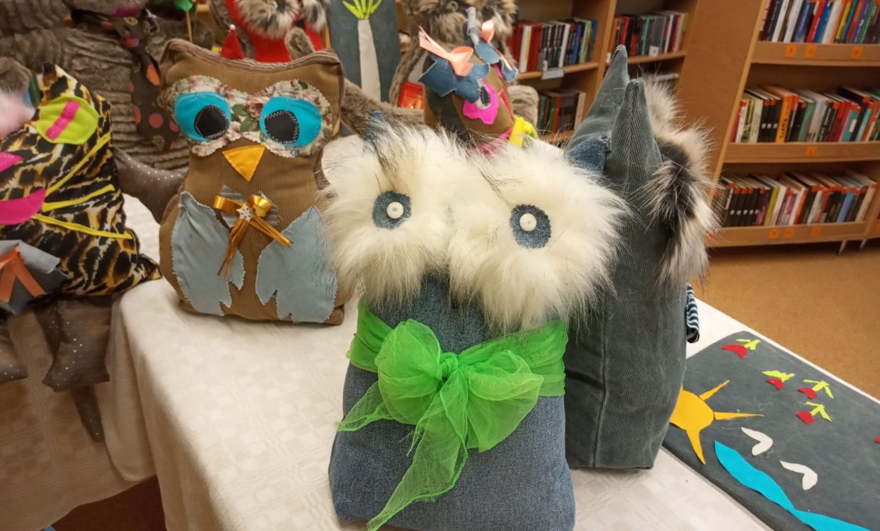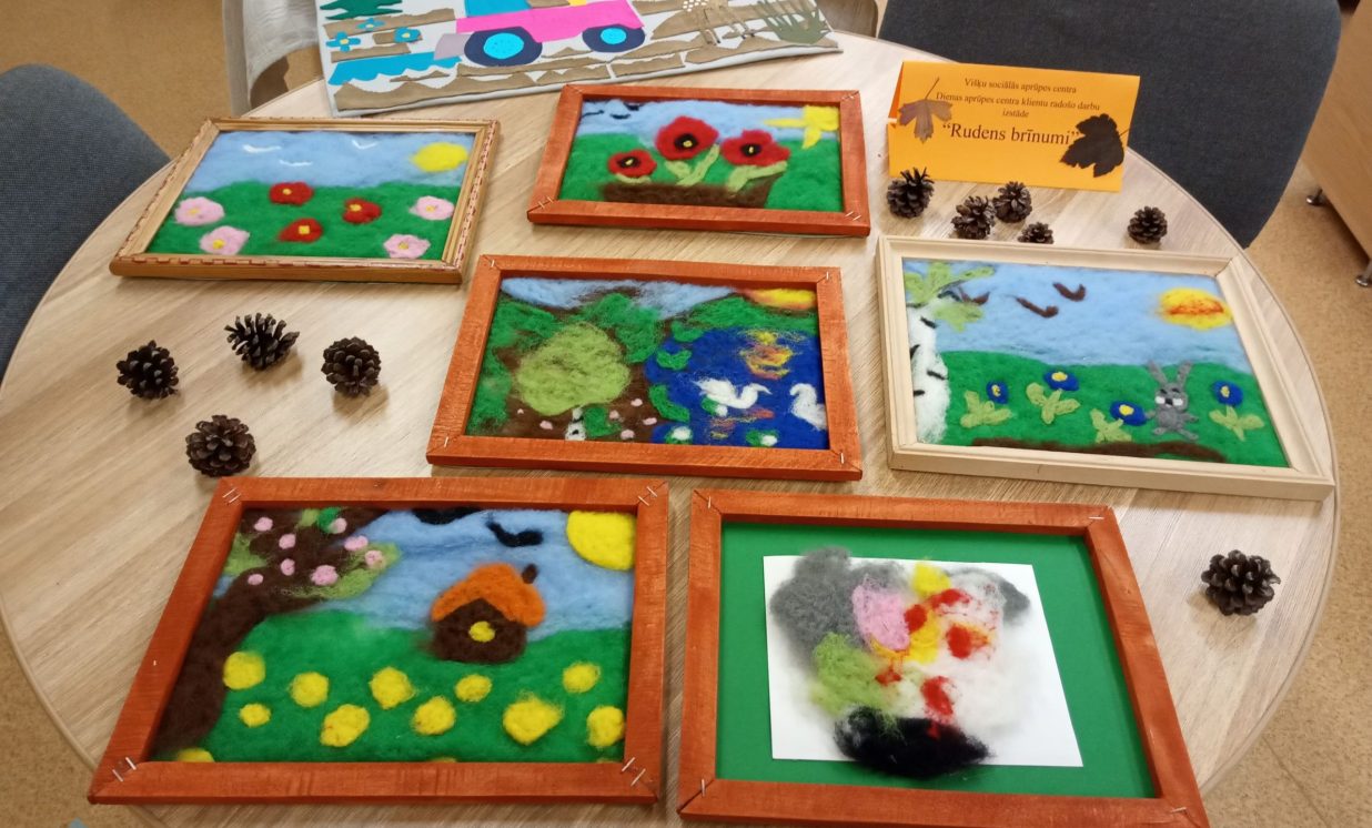 Bibliotēkā var aplūkot arī Višķu sociālās aprūpes centra, Dienas aprūpes centra klientu ar īpašām vajadzībām radošo darbu izstāde “Rudens brīnumi”, kas tapusi personām ar GRT projekta “Deinstitucionalizācijas pasākumu īstenošana Latgales reģionā” Nr. 9.2.2.1./15/I/005 ietvaros. Izstādē redzamie darbiņi izpildīti dažādās tehnikās, interesantie dzīvnieciņi, mazās pūcītes un filcētās glezniņas. Darbiņi izgatavoti no dažādu materiālu atgriezumiem, koka un kartona. Šeit var smelties idejas radošām darbnīcām. Bibliotēkai ir izveidojusies veiksmīga sadarbība ar Višķu dienas aprūpes centru un filcētās glezniņas tapušas radošā darbnīcā no vilnas. Paldies atraktīvajām un enerģiskajām Dienas centra darbiniecēm Svetlanai Miglānei un Terēzijai Aleksejevai par sadarbību un jauniem izaicinājumiem.