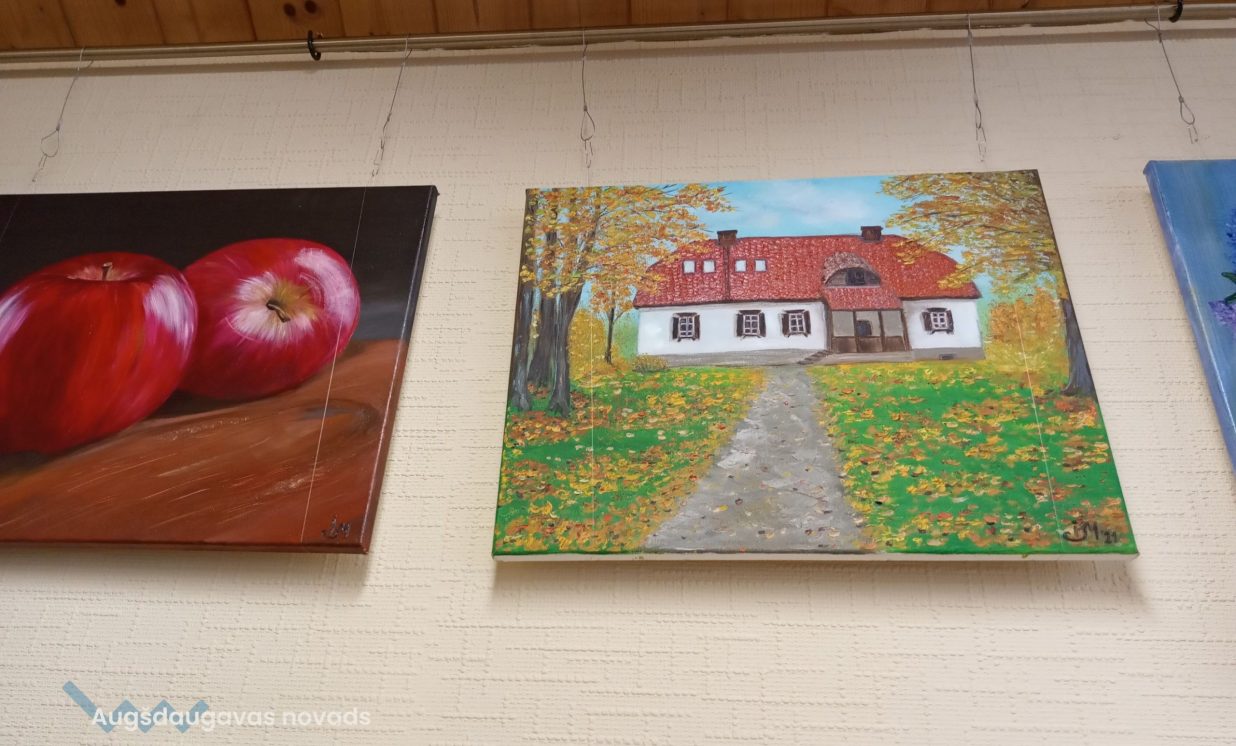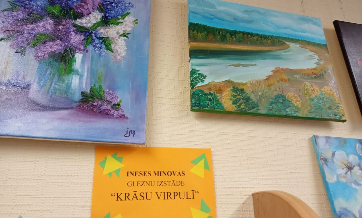 Ineses Minovas gleznu izstāde “Krāsu virpulī”. Izvietojot gleznas bibliotēkā sajutu mākslinieces pozitīvo enerģiju un siltumu, ko gleznas izstaro. Bibliotēkā kļūst mājīgi, telpa piepildās ar īpašu auru. Gleznās attēlotie ziedi, dabas skati, kaķis ir kā dzīvi un pēc sārtā ābola roka pastiepjas paņemt no galda.