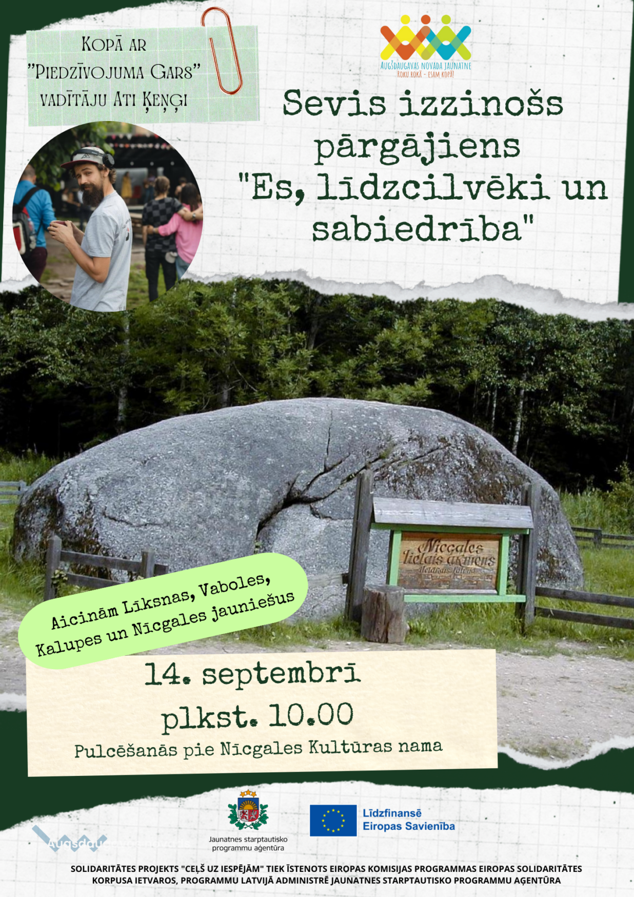 Aicinām Tevi uz sevis izzinošu pārgājienu "Es, līdzcilvēki un sabiedrība" kopā ar organizācijas "Piedzīvojumu gars" vadītāju un indivīda izaugsmes treneri Ati Ķeņģi.