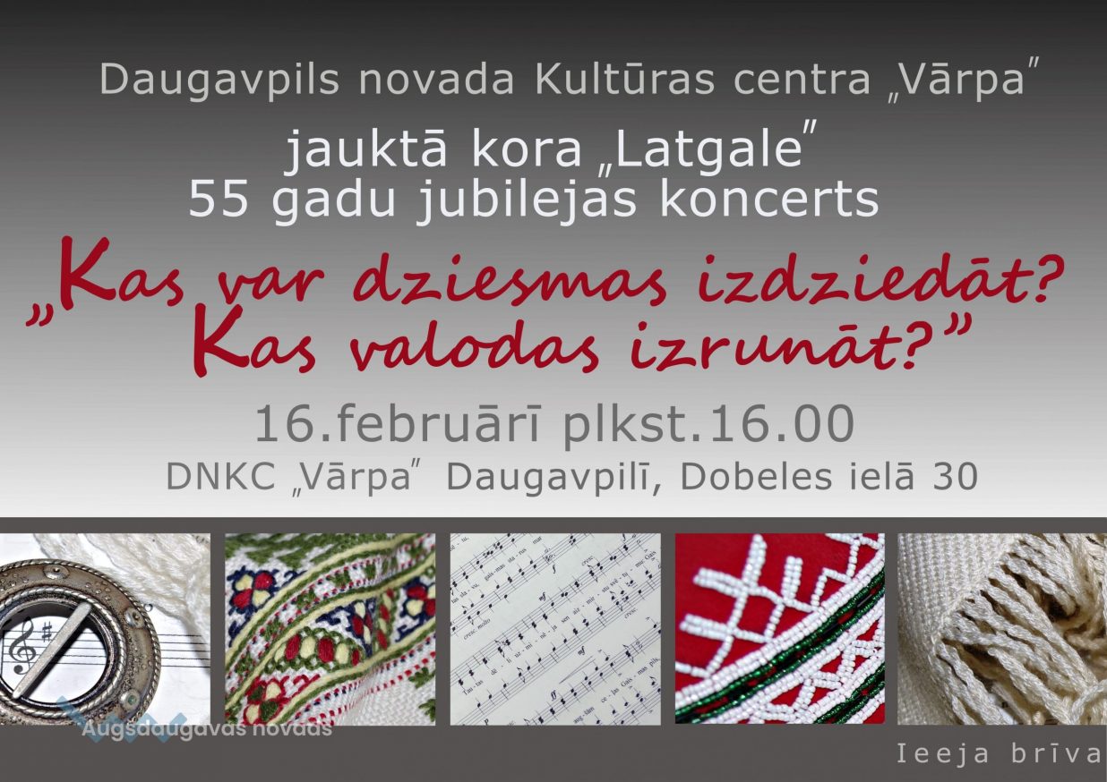 Sestdien, 16. februārī, plkst. 16.00 Daugavpils novada Kultūras centrā „Vārpa” (Daugavpilī, Dobeles ielā 30) notiks jauktā kora „Latgale” 55 gadu jubilejas koncerts „Kas var dziesmas izdziedāt? Kas valodas izrunāt?”.