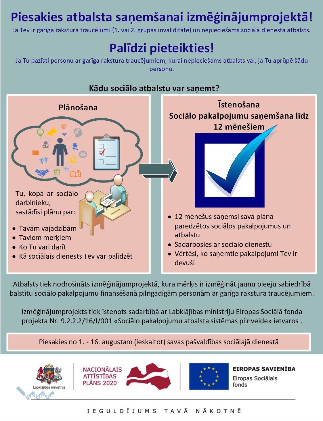 Pieteikšanās dalībai izmēģinājumprojektā ilgs no 01.08.2019. līdz 16.08.2019. (ieskaitot). Ja vienā pašvaldībā dalībai izmēģinājumprojektā pieteiksies vairāk par 10 personām, pie vienlīdzīgiem atlases kritēriju vērtējumiem, priekšroka tiks dota personām, kuras iesniegumu būs iesniegušas ātrāk. Pieteikumi, kas tiks iesniegti pirms 01.08.2019. netiks pieņemti!
