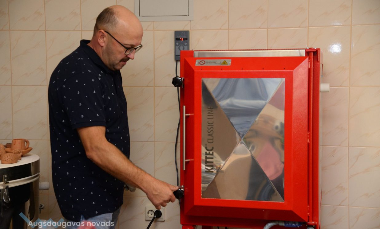 Telpā, kur darbojas jaunā krāsns, drēgnajā rudens dienā ir mājīgi silti un neparasti smaržo. Krāsnī tūlīt būs gatavi jaunākie darbiņi. Gan nepieciešamā temperatūra, gan laiks tiek regulēts automātiski, tāpēc krāsns nevienam nav īpaši jāuzmana, vajadzīgajā brīdī tā izslēgsies un atdzisīs.
