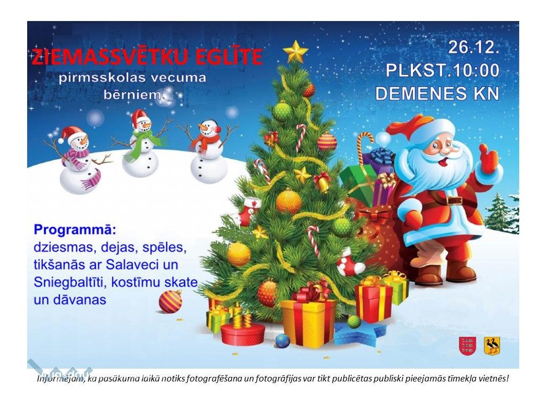 Aicinām 26. decembrī plkst. 10.00 Demenes Kultūras namā (Briģenes iela 2, Demenē) uz Jaungada eglīti pirmsskolas vecuma bērniem.