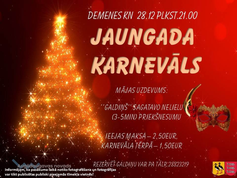 Aicinām Demenes pagasta iedzīvotājus un viesus 28.decembrī plkst. 21.00 Demenes Kultūras namā (Briģenes iela 2, Demenē) uz gada noslēguma pasākumu “Jaungada karnevāls”.