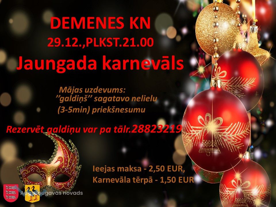 Jaungada karnevāls Demenē18.12.2017AKTUĀLI Aicinām Demenes pagasta iedzīvotājus un viesus 29.decembrī plkst. 21.00 Demenes Kultūras namā (Briģenes iela 2, Demenē) uz gada noslēguma pasākumu “Jaungada karnevāls”.Mājas uzdevums katram “galdiņam” – sagatavot nelielu (3-5 min) priekšnesumu.Rezervēt galdiņu var pa tālr. 28823219Ieejas maksa: 2,50 EURKarnevālā tērpā: 1,50 EUR