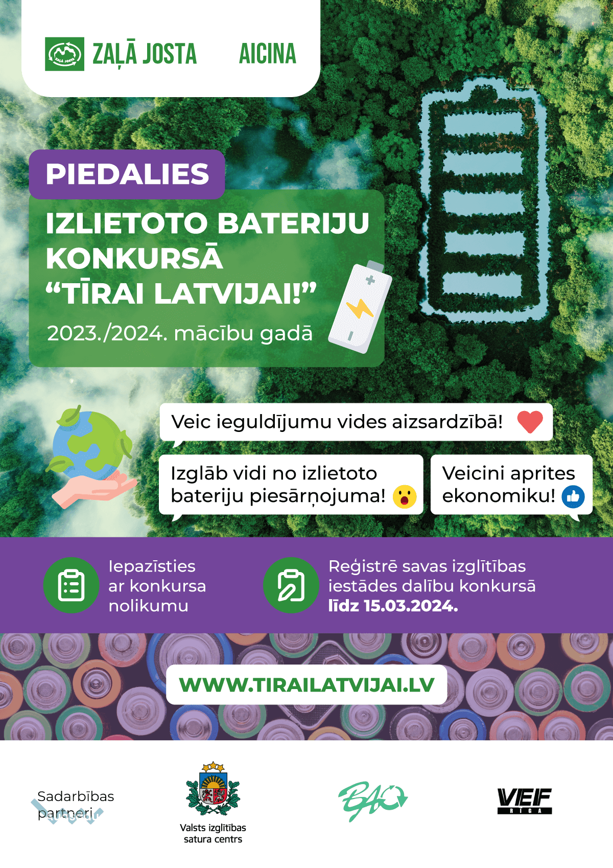 Ražotāju atbildības sistēmas uzņēmums “Zaļā josta” sadarbībā ar Valsts izglītības satura centru, atkritumu apsaimniekotāju “CleanR” un citiem partneriem ir uzsākusi kampaņu “Tīrai Latvijai”, kuras laikā skolēni, pirmsskolas vecuma bērni un viņu ģimenes locekļi izglītības iestādēs tiek aicināti vākt papīra iepakojumu, makulatūru un izlietotās baterijas, informē “Zaļās jostas” vides izglītības vadītāja Aija Caune.