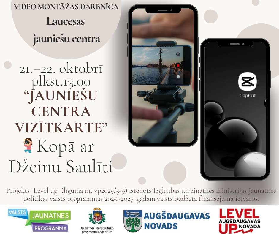21. un 22. oktobrī Laucesas jauniešu centrā notiks video montāžas darbnīca “Jauniešu centra vizītkarte”, kurā jaunieši apgūs video filmēšanas un montāžas pamatus, izmantojot tikai savu viedtālruni un lietotni CapCut. Darbnīcu vadīs video un satura veidošanas speciāliste Džeina Saulīte.