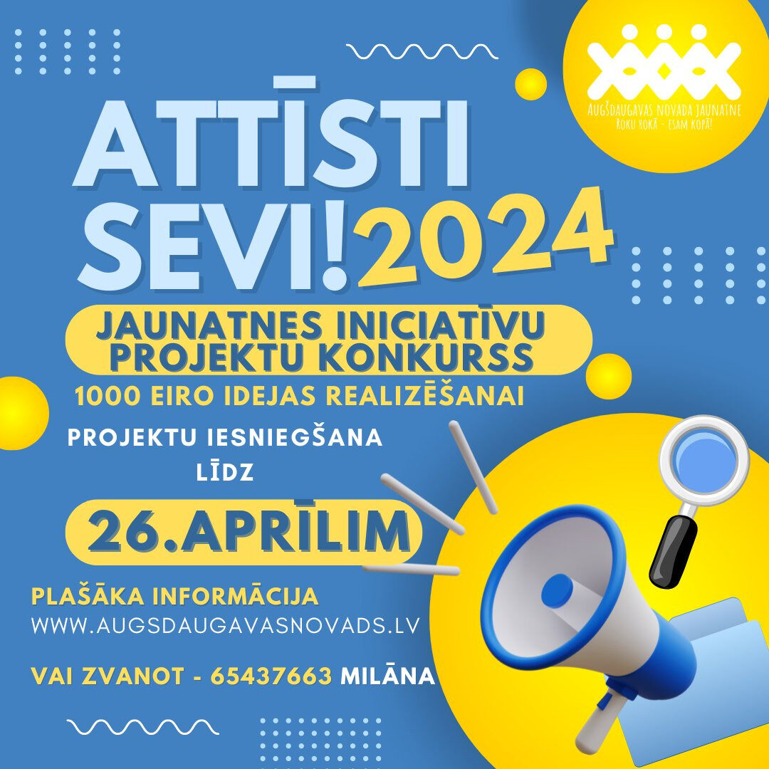 Sākot ar 18. martu Augšdaugavas novada pašvaldība uzsāk projektu pieteikumu pieņemšanu jauniešu iniciatīvu projektu konkursā “Attīsti sevi!”. Kopumā tiek plānots atbalstīt septiņus projektus, nosakot to fiksēto atbalsta summu – 1000,00 eiro.