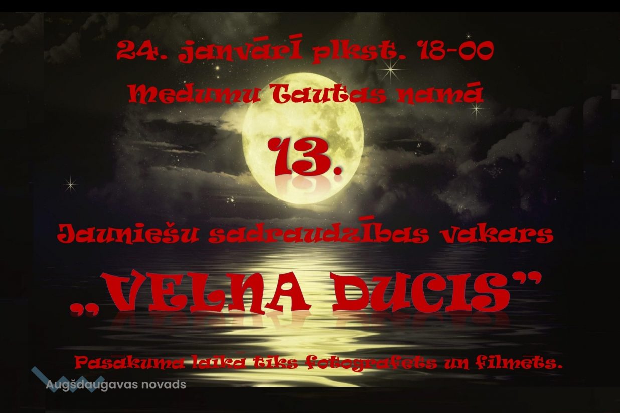 2020.gada 24.janvārī, plkst. 18.00, Medumu Tautas namā notiks jauniešu sadraudzības pasākums “VELNA DUCIS”. Katram pagastam jāsagatavo mājas darbu (ainu, deju, dziesmu). Dalībniekiem un viesiem, lūgums, ievērot dreskodu: apģērbs melnā un sarkanā krāsā. Pasākumā var piedalīties Daugavpils novada jaunieši vecumā no 13 – 25 gadiem.