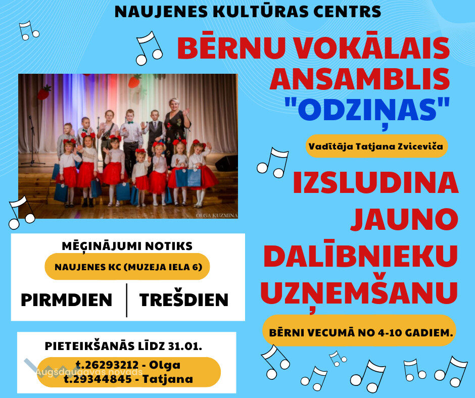 Vokālajā ansamblī "Odziņas" tiek gaidīti bērni vecumā no 4 līdz10 gadiem. Dalībnieki var pieteikties zvanot: * Vokāla ansambļa “Odziņas” vadītājai Tatjanai Zvicevičai pa tālr. 29344845 * Naujenes Kultūras centra vadītājai Olgai Pankovai pa tālr. 26293212.