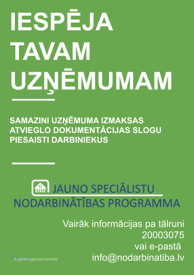 Tagad arī Daugavpils novada uzņēmējiem ir iespēja iesaistīties Jauno speciālistu nodarbinātības programmā! Jauno speciālistu nodarbinātības programma nodrošina iespēju uzņēmumiem sagatavot sev nepieciešamos darbiniekus. Ar Jauno speciālistu nodarbinātības programmas starpniecību, jebkurš ieinteresētais uzņēmums var sagatavot sev nepieciešamos darbiniekus izmantojot darba vidē balstītu apmācību iespējas. Programmā var iesaistīties jebkurš uzņēmums – SIA, AS, ZS, biedrības, nodibinājumi u.c.
