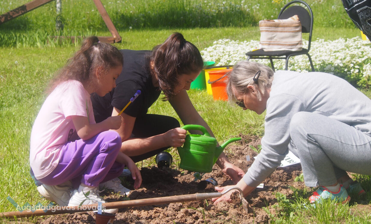 Īpašs pasākuma brīdis bija jauna dārza veidošana – visi kopā stādīja ķirbju, arbūzu un meloņu stādus, veicinot gan dabas procesu izpratni, gan ģimenes saliedētību.