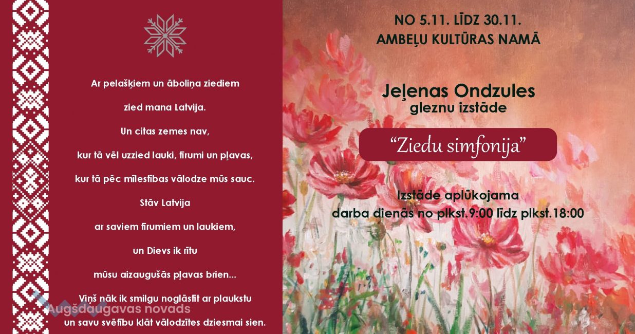 Datums: no 5. līdz 30. novembrim Vieta: Ambeļu kultūras nams Kas norisinās?: Jeļenas Ondzules gleznu izstāde "Ziedu simfonija". Izstāde aplūkojama darba dienās no plkst. 9.00 līdz plkst. 18.00. Apmeklētājus lūdz ievērot valstī noteiktās epidemioloģiskās drošības prasības! Tālrunis uzziņām: 291 42 802