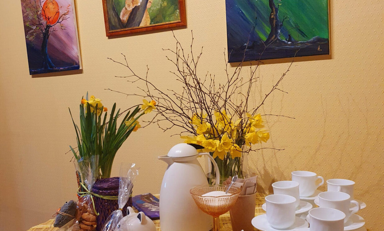 Pēc pasākuma padzērām tēju ar garšīgiem “kaķu” cepumiem, kurus speciāli izstādes atklāšanai pagatavoja Kalkūnes un Medumu jaunieši, par ko īpašs paldies!