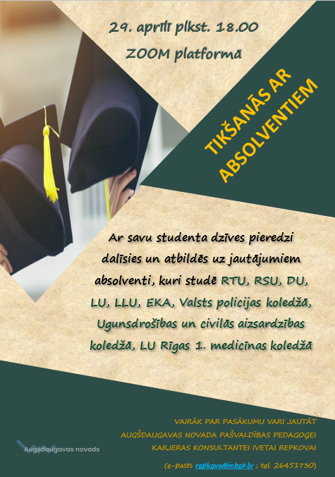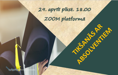 29. aprīlī plkst.18:00 Augšdaugavas novada vidusskolu jaunieši tiek aicināti uz karjeras attīstības atbalsta pasākumu "Tikšanās ar absolventiem" ZOOM platformā. Pasākumā studenti no vairākām augstākās izglītības iestādēm dalīsies ar savu studiju pieredzi un atbildēs uz interesentu jautājumiem.