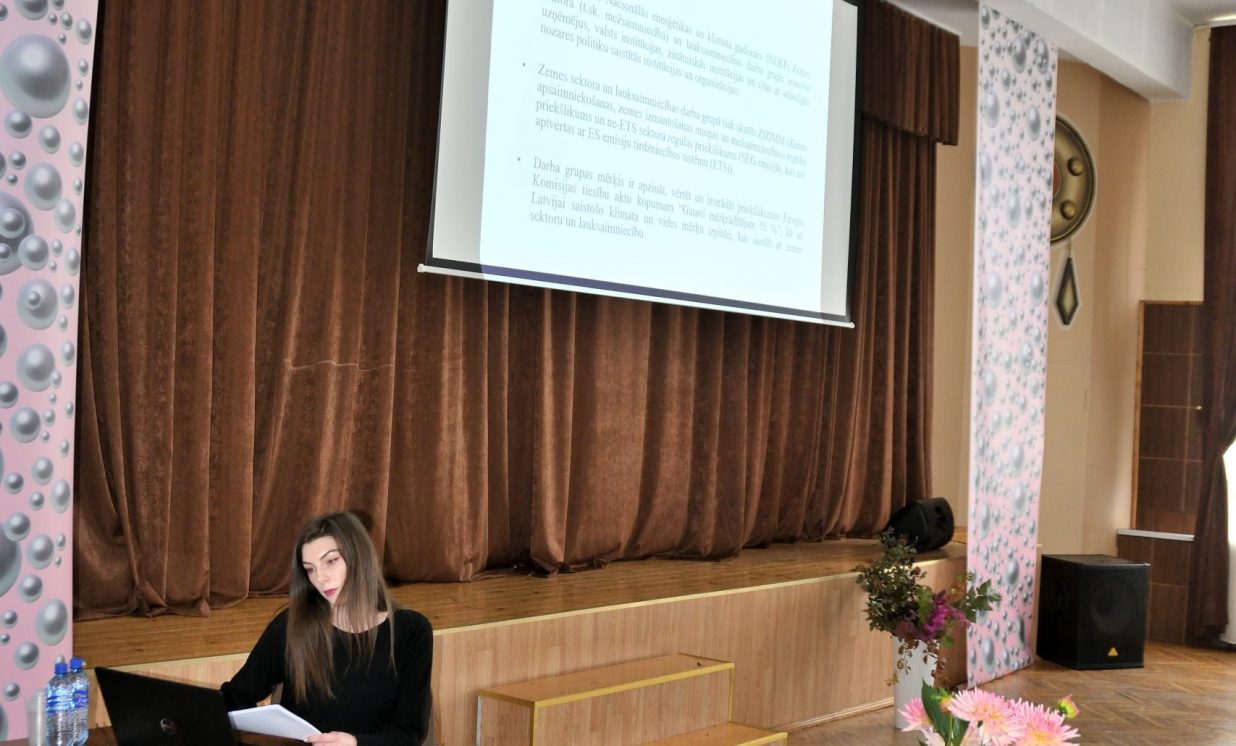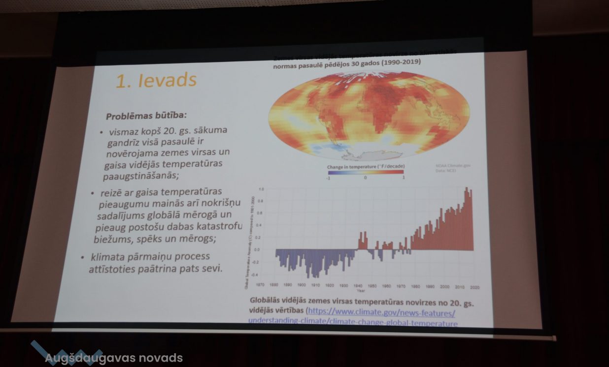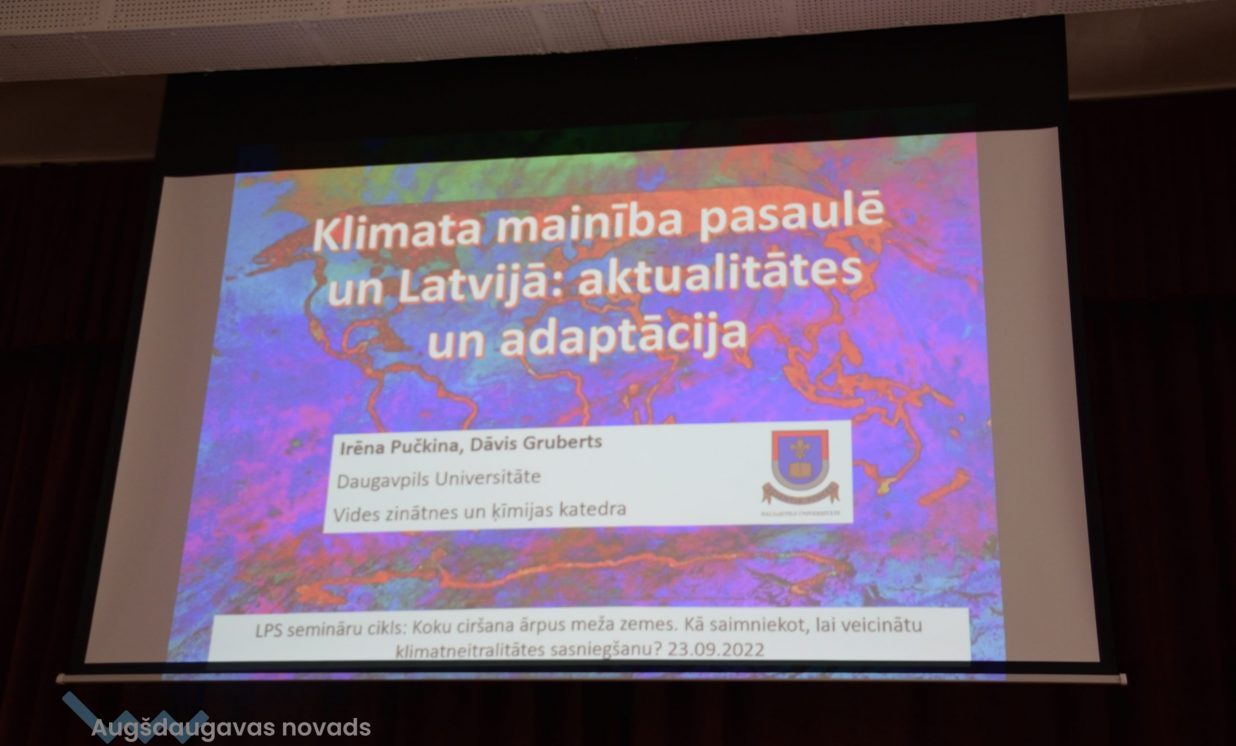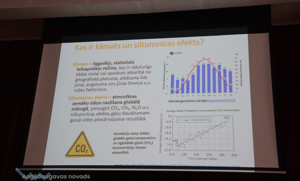 Daugavpils Universitātes Vides zinātnes un ķīmijas katedras pārstāve Irēna Pučkina klātesošiem skaidroja klimata un siltumnīcas efekta nozīmi, globālās sasilšanas procesu un tā sekas, iepazīstināja ar nākotnes klimata prognozēm un klimata pārmaiņām Latvijā, kā arī adaptāciju tām. Pēc I. Pučkinas teiktā, vismaz kopš 20. gs. sākuma praktiski visā pasaulē ir vērojama zemes virsas temperatūras paaugstināšanās, kas reizē nes arī nokrišņu pieaugumu un dabas katastrofu biežuma palielināšanos. Cilvēka darbības rezultātā, proti, fosilā kurināmā sadedzināšanas rezultātā un intensīvās lauksaimniecības dēļ, Zemes atmosfērā strauji pieaug oglekļa dioksīda (CO2), metāna (CH4) un dislāpekļa oksīda (N20) apjoms. Pētnieki prognozē, ka Latvijā līdz 2100. gadam vidējā gaisa temperatūra arvien palielināsies. Krasākās izmaiņas būs sagaidāmas valsts austrumu daļā ziemas periodā. Ziemā pieaugs minimālās temperatūras grādi, bet vasarā maksimālās gaisa temperatūras rādītāji. Nākotnē Latviju sagaida karstuma viļņu biežums un ilgums, kā arī tropisko nakšu un vasaras dienu skaits. Paaugstināsies augšanas sezonas ilgums par 1 līdz 2 mēnešiem. Nākotnē nāksies saskarties ar Latvijas teritorijai neraksturīgiem un ekstremāliem laika apstākļiem.