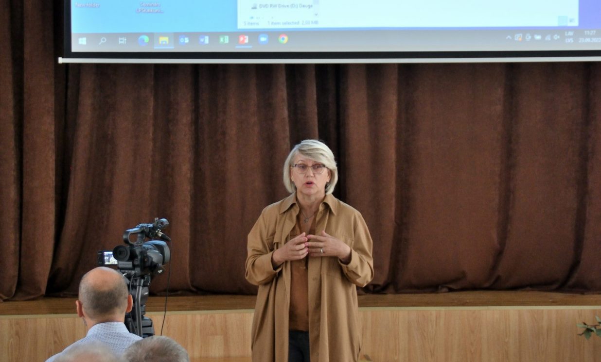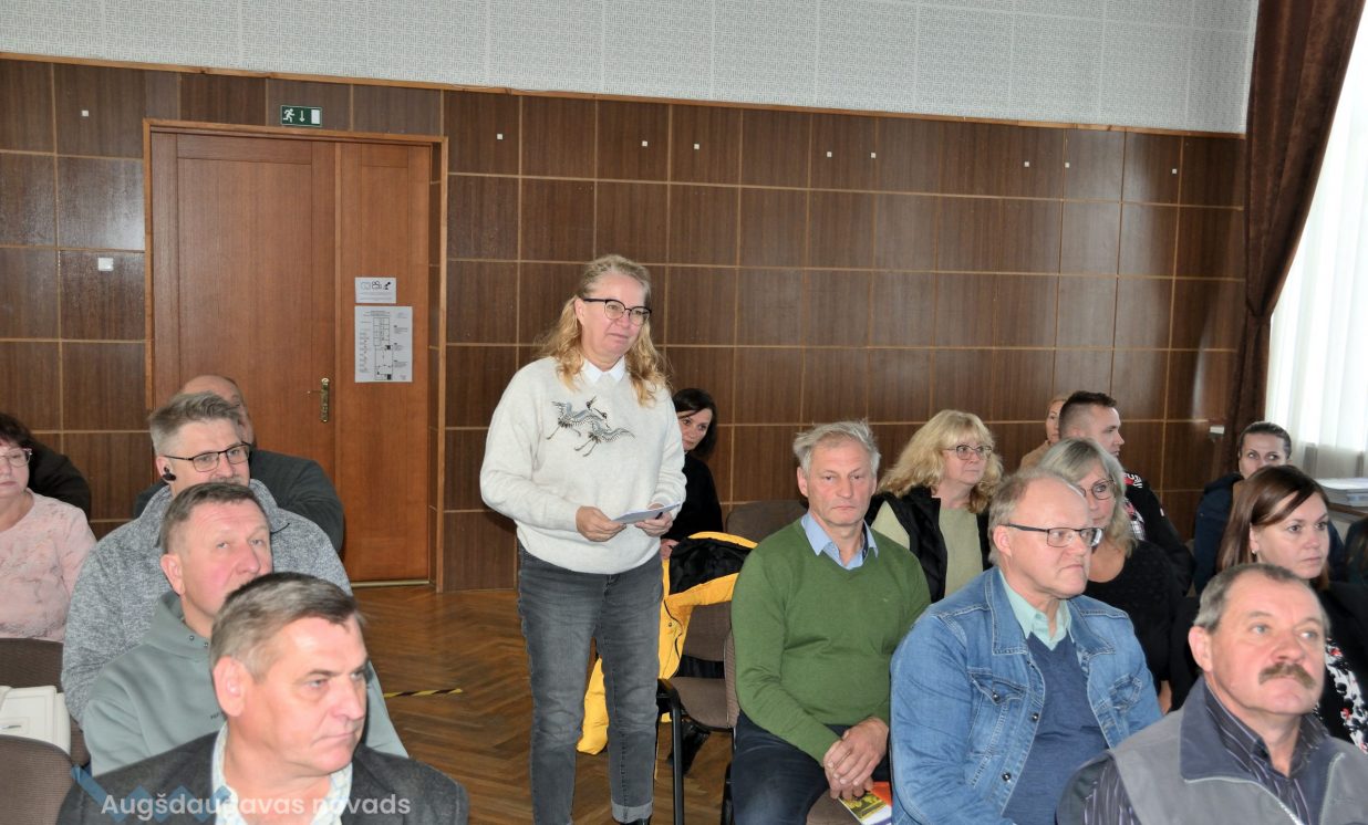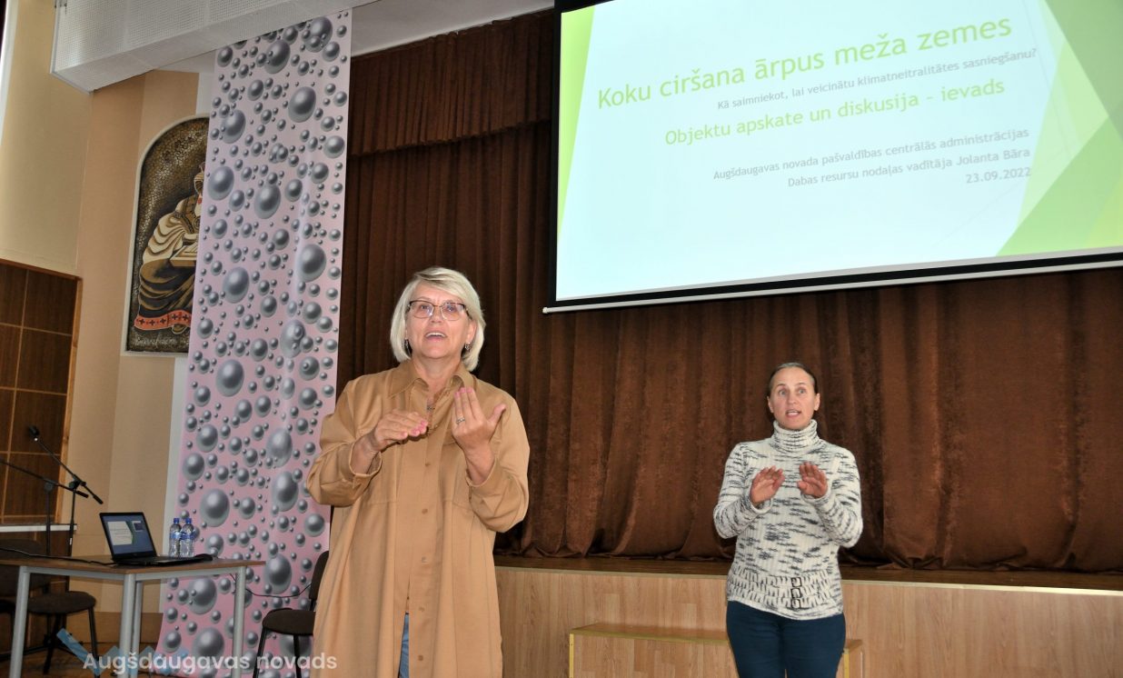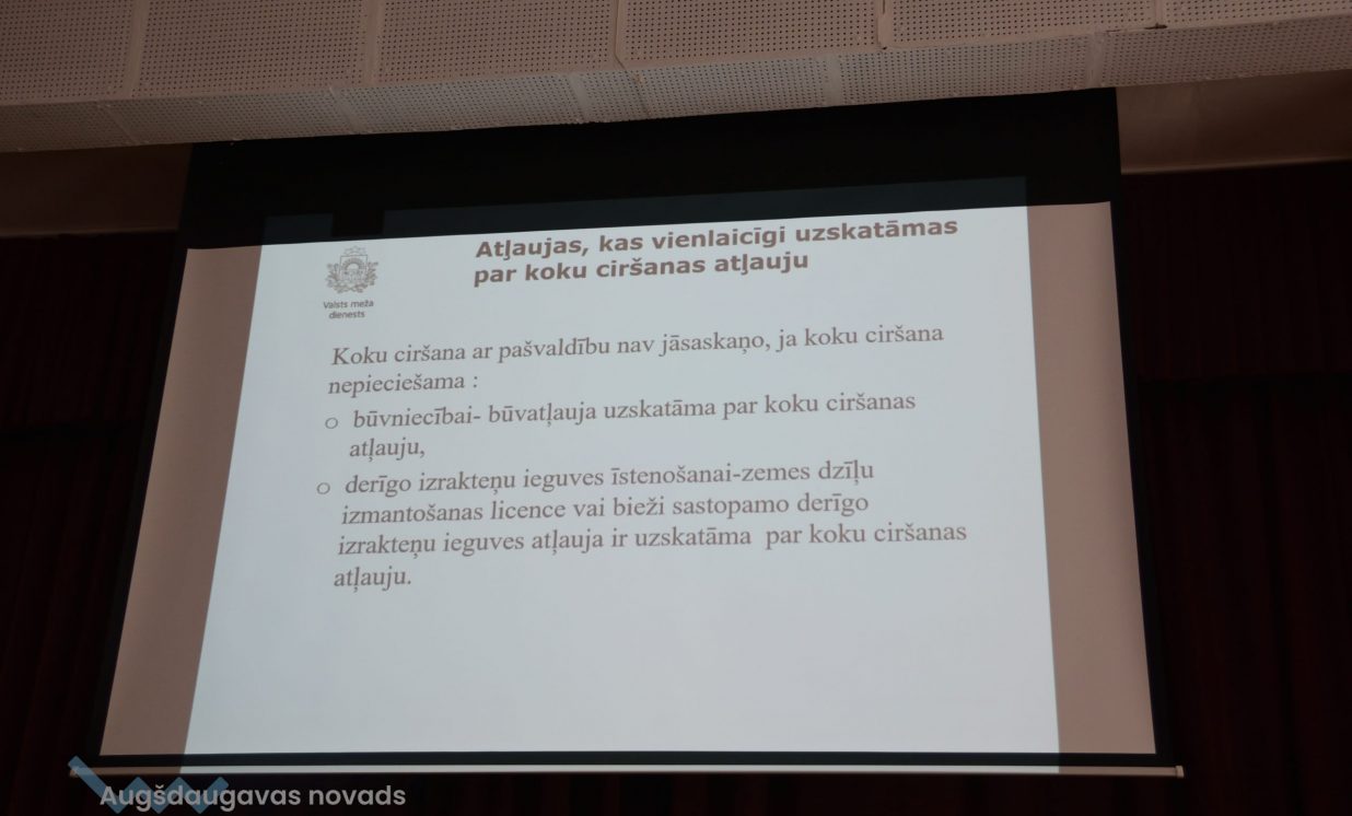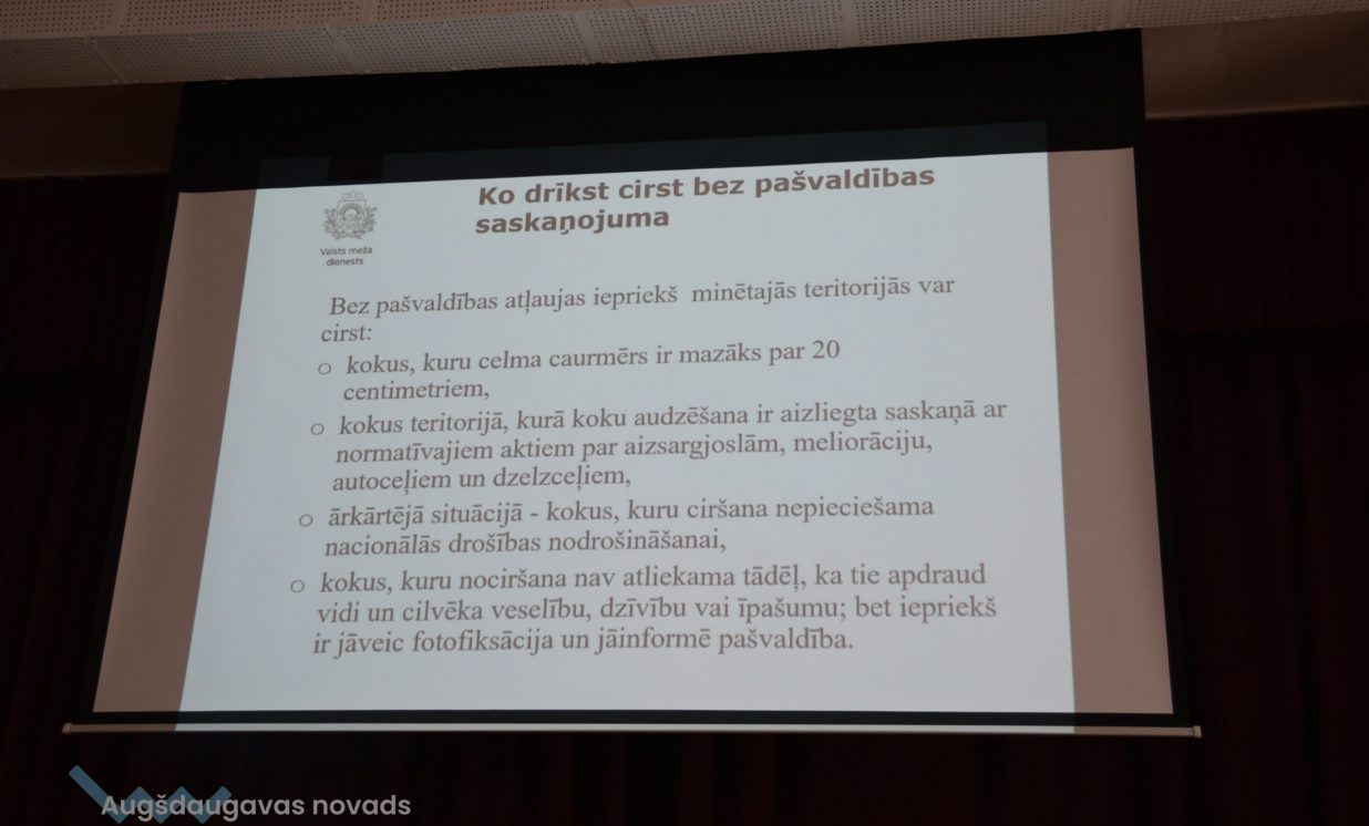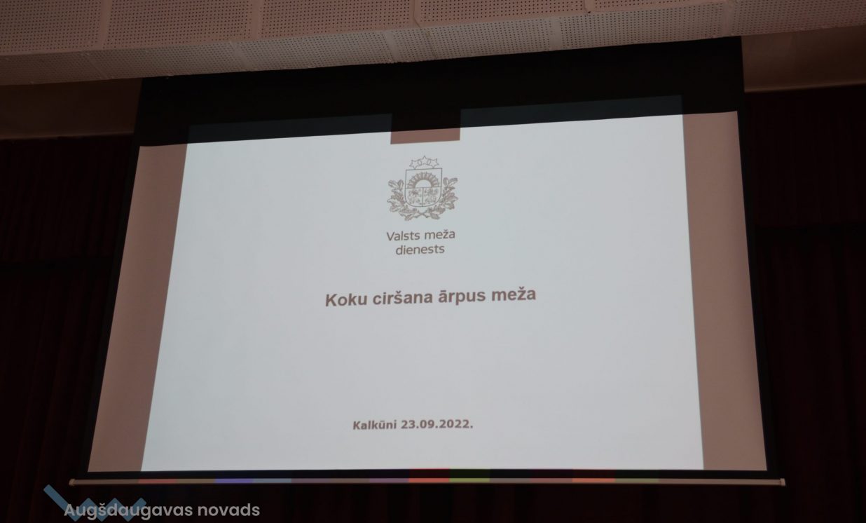 Valsts Meža dienesta Dienvidlatgales virsmežniecības inženiere Lilija Teivāne klātesošos iepazīstināja ar koku ciršanas īpatnībām lausaimniecības zemēs. Viņa uzsvēra, ka, padziļinoties enerģētiskajai krīzei un pieprasījumam, iespējams, pieaugs koku ciršanas apjomi gan mežā, gan ārpus meža, tādēļ ir svarīgi nošķirt, kad cērt kokus mežā un kad ārpus meža, jo abiem gadījumiem ir atšķirīgs normatīvais regulējums. Par mežu zemi neuzskata autoceļa, dzelzceļa, elektrisko tīklu, sakaru tīklu, gāzes vadu, naftas vadu, ūdensvadu zemes nodalījuma joslu, kā arī kapsētas. Mākslīgās vai dabiskās koku rindas, kuru platums ir mazāks par 20 m, augļu dārzi, parki vai kokaudzētavas arī netiek pieskaitītas pie mežiem. Līdzīgi ir arī ar atsevišķi no meža esošu patību, kas atbilst meža definīcijai, bet tā nav reģistrēta un ir mazāka par 0,5 ha. Speciāliste arī skaidroja, kad ir nepieciešamas pašvaldības atļaujas, cērtot kokus, kā arī minēja gadījumus, kad platības jāizvērtē pēc atbilstības kategorijai “mežs”. Bez pašvaldības saskaņojuma var cirst kokus, kuru celms ir mazāks par 20 cm, tāpat to ļauts darīt teritorijās, kur koku audzēšana ir liegta saskaņā ar normatīvajiem aktiem. Koku nociršanu nedrīkst atlikt, ja tie apdraud vidi un cilvēka veselību, dzīvību vai īpašumu, bet, pirms to veikt, jāveic fotofiksācija un jāinformē pašvaldība. Aktuālo informāciju par koku ciršanu ir iespējams meklēt dabas datu pārvaldības sistēmā “Ozols”: https://ozols.gov.lv/pub. Par koku ciršanu meža zemēs jāziņo Valsts meža dienestam, norādot zemes vienības kadastra apzīmējumu un plānoto ciršanas apjomu. To ir iespējams izdarīt tiešsaistē Meža reģistrā: https://gis.vmd.gov.lv.