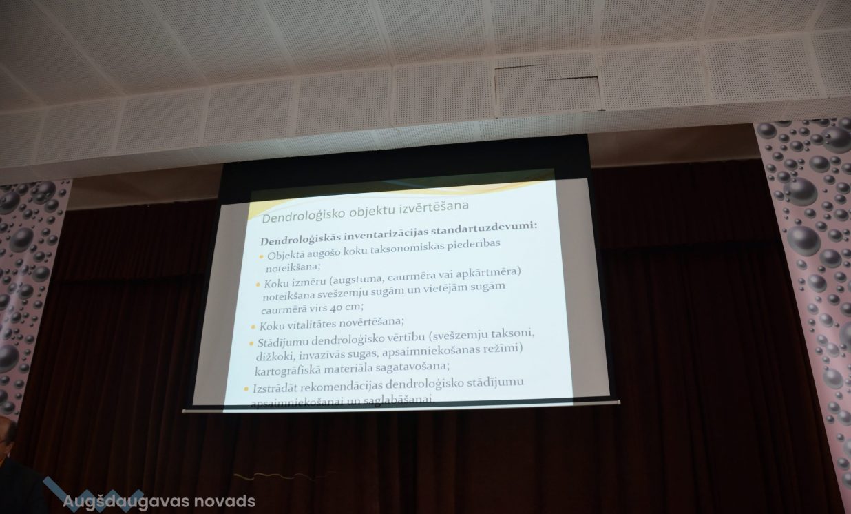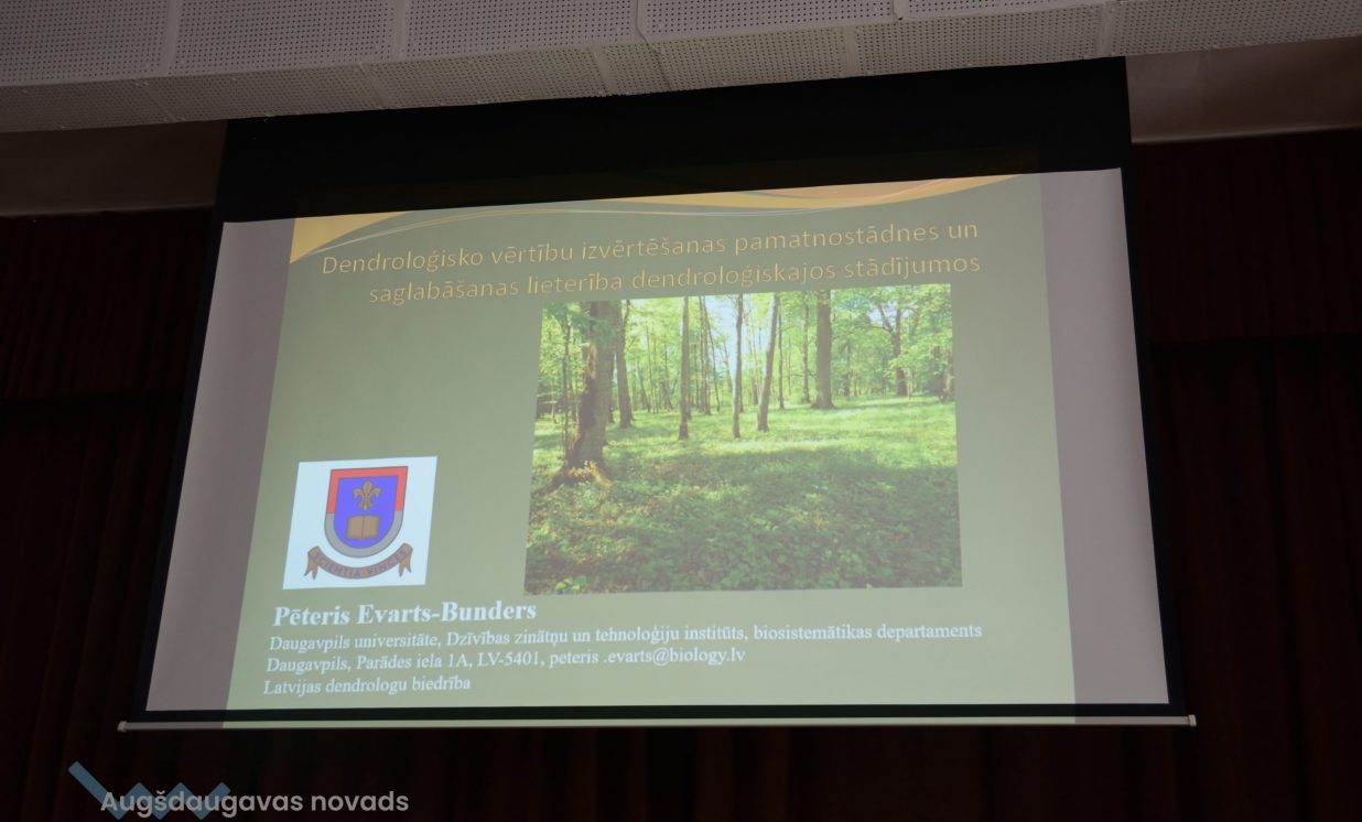 Daugavpils Universitātes docents, dr. biol. Pēteris Evarts – Bunders uzstājās ar prezentāciju par dendroloģisko vērtību izvērtēšanas pamatnostādnēm un dendroloģisko vērtību saglabāšanas lietderību sabiedriskajos stādījumos. Nosakot dendroloģisko vērtīgumu, DU pētnieki uzmanību pievērš stādījumu taksonomiskajam sastāvam, reģionālai unikalitātei, dižkoku esamībai objektā, savdabīgo koku esamībai dendroloģiskajos stādījumos u.c. kritērijiem. Nosakot, vai konkrētais parks ir saglabājams, vērā tiek ņemts arī tā ainaviskums, publiskās pieejamības nodrošināšana, informatīvo materiālu jeb stendu esamība.