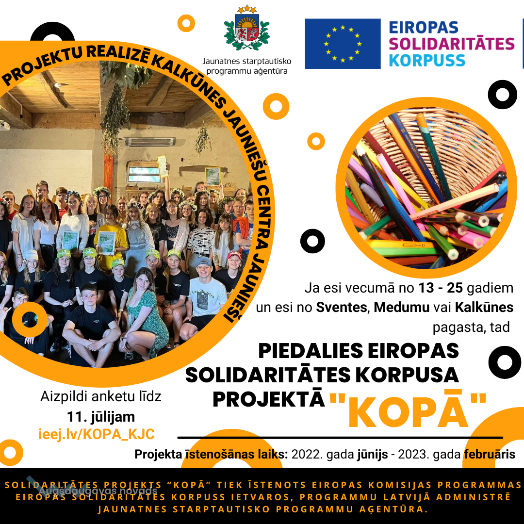 Solidaritātes projekts “KOPĀ” tiek īstenots Eiropas Komisijas programmas Eiropas Solidaritātes korpuss ietvaros, programmu Latvijā administrē Jaunatnes starptautisko programmu aģentūra.