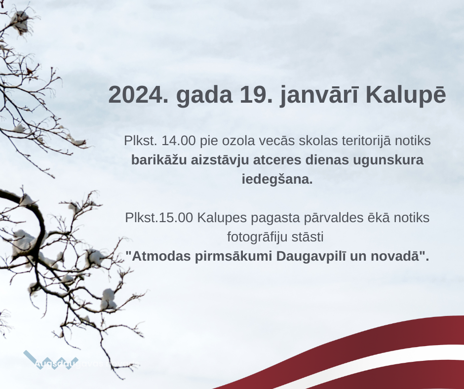 Aicinām 19.janvārī uz barikāžu aizstāvju atceres dienas pasākumu Kalupē. Plkst. 14.00 barikāžu aizstāvju atceres dienas ugunskura iedegšana vecās skolas teritorijā pie ozola. Plkst. 15.00 Kalupes pagasta pārvaldes ēkā tikšanās ar barikāžu dalībniekiem. Ar fotomateriāliem un stāstiem par atmodas pirmsākumiem Daugavpilī un novadā dalīsies Ģertrūde Rasnače, Henrihs Soms, Ināra Mukāne, Arnis Slobožaņins un Ivo Bikuļčs.