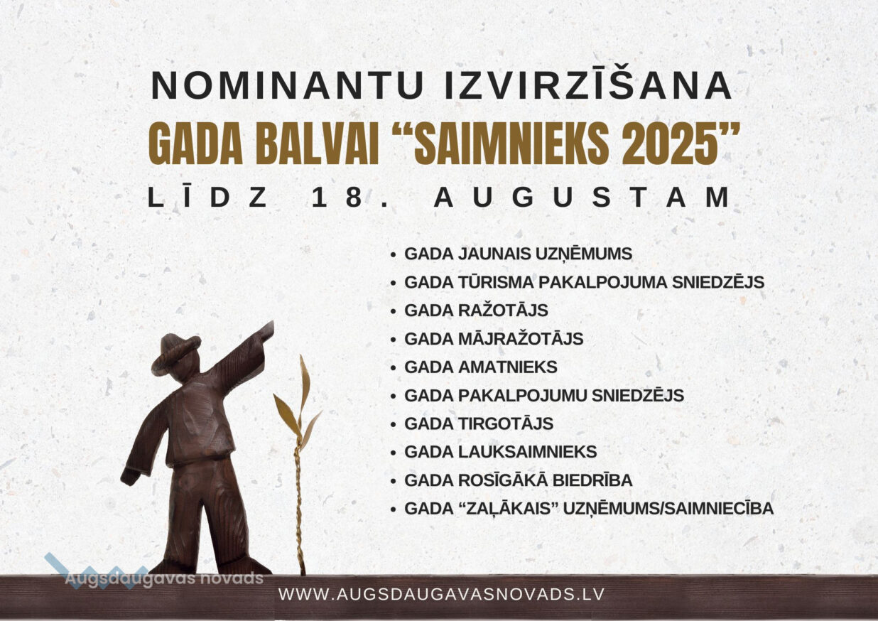 Augšdaugavas novada pašvaldība organizē Konkursu “Saimnieks 2025” ar mērķi apzināt un godināt Augšdaugavas novada uzņēmējus, kuri aktīvi un godprātīgi darbojas savā nozarē, sekmējot uzņēmējdarbības vides attīstību Augšdaugavas novadā, un veicināt novada uzņēmēju atpazīstamību, popularizējot labas uzņēmējdarbības prakses piemērus novadā.