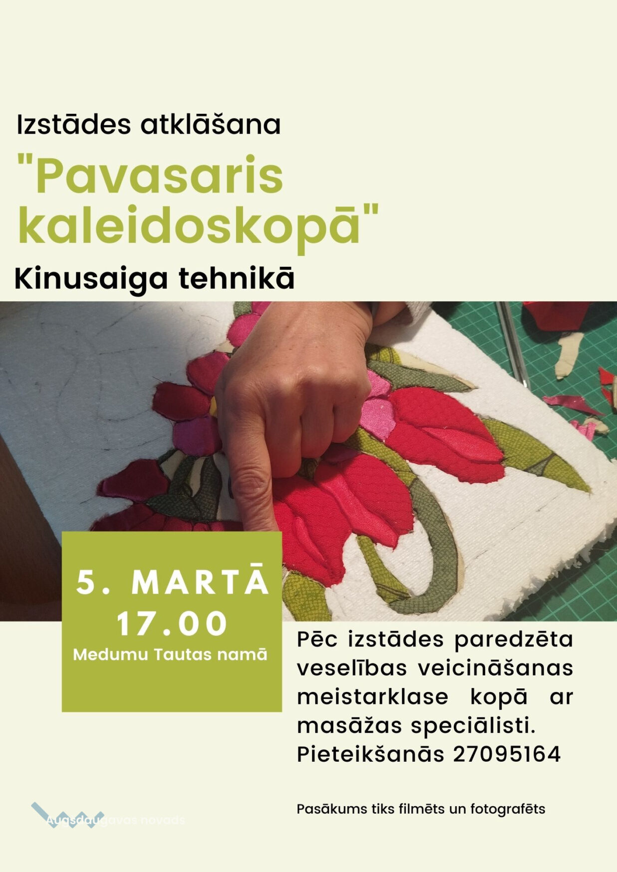 5. martā, plkst. 17.00, Medumu Tautas namā notiks rokdarbu pulciņa “Kaleidoskops” izstāde “Pavasaris kaleidoskopā”, kas tapusi kinusaiga tehnikā. Kinusaiga ir amatieru mākslas veids, kas ietver mākslas priekšmetu radīšanu, līdzīgi mozaīkai, no dažādu krāsu auduma gabaliņiem. Pēc izstādes atklāšanas notiks veselības veicināšanas meistarklase ar masāžas speciālisti Ilgu Vorslavu, kurā būs iespēja apgūt pašmasāžu. Vietu skaits ierobežots. Lūdzam pierakstīties, 27095164 (sms).