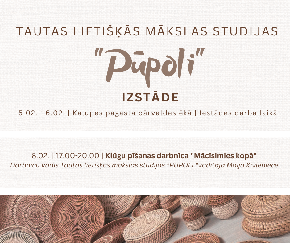NovadsAktualitātesJaunumiKlūgu pīšanas darbnīca un tautas lietišķās mākslas studijas “Pūpoli” izstāde Kalupē