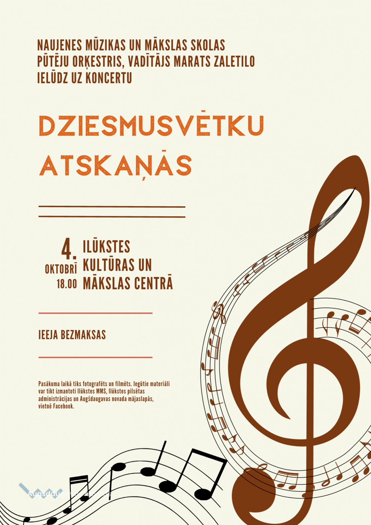 Koncerts “Dziesmusvētku atskaņās” Ilūkstē27.09.2023AKTUĀLI Naujenes MMS pūtēju orķestris, vadītājs Marats Zaletilo, ielūdz uz koncertu “Dziesmusvētku atskaņās” 4. oktobrī 18.00 Ilūkstes Kultūras un mākslas centrā.Ieeja bezmaksasVisi laipni aicināti!