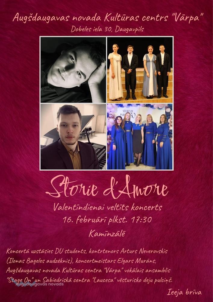 Augšdaugavas novada Kultūras centrā “Vārpa” 16. februārī plkst. 17.30 izskanēs Valentīndienai veltīts koncerts "Storie d'Amore".
