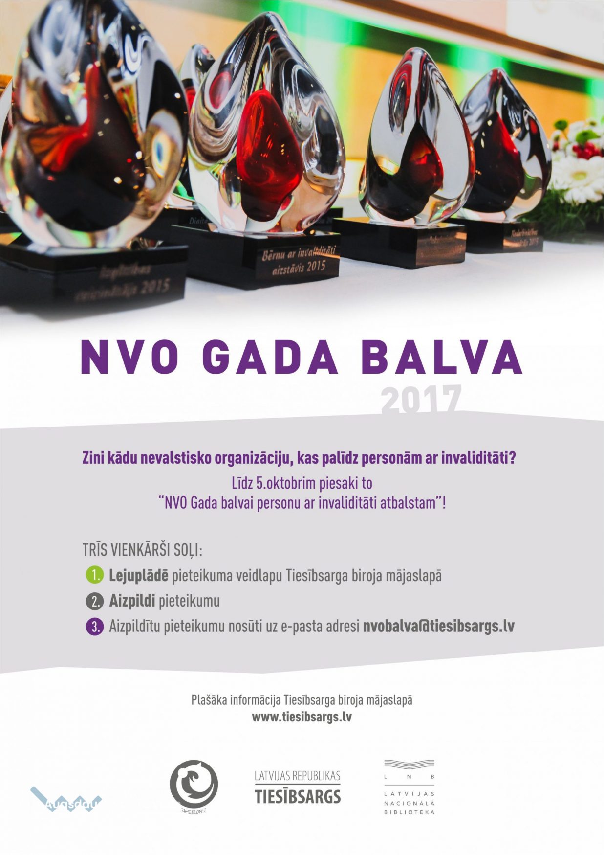 Ikviens var pieteikt nevalstisko organizāciju kādā no nominācijām, līdz 5. oktobrim nosūtot pieteikumu uz e-pasta adresi nvobalva@tiesibsargs.lv. Pielikumā konkursa nolikums un pieteikuma veidlapa. Nevalstisko organizāciju apbalvošana notiks šī gada 29. novembrī Latvijas Nacionālajā bibliotēkā.