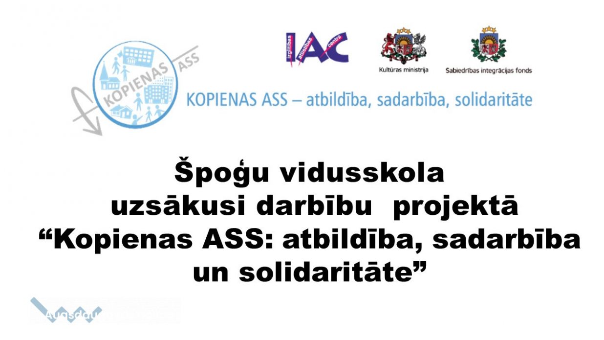Špoģu vidusskola uzsākusi darbību projektā “Kopienas ASS: atbildība, sadarbība un solidaritāte”, kuru īsteno Izglītības attīstības centrs (IAC) un finansiāli atbalsta Sabiedrības integrācijas fonds no Kultūras ministrijas piešķirtajiem Latvijas valsts budžeta līdzekļiem. Projekta īstenošanas laiks 2022.gada janvāris- oktobris. Projektā iesaistījušās 8 Latvijas skolas. Katrā skolas komandā-trīs pedagogi. Projekta mērķis - veicināt pilsoniskas sabiedrības ilgtspēju un demokrātijas vērtību īstenošanu ikdienas rīcībā, paaugstinot pedagogu un jauniešu pilsoniskās līdzdalības kompetenci - paplašinot izpratni par pilsonisko līdzdalību un apgūstot pilsoniskās izglītības programmu “Kopienas ASS: atbildība, sadarbība un solidaritāte”; praktizējot sociāli atbildīgu, sadarbīgu un solidāru iesaisti pilsoniskās līdzdalības iniciatīvās vietējās kopienā. Skolas darbība norit daudzkultūru vidē. Katras kultūras indivīds nes sevī savas vērtības un ideālus. Skolā tiek radīta un uzturēta vide, kurā uzkrājas materiālais un nemateriālais mantojums, tiek praktizēta kultūras un mākslas jaunrade, bet mēs vēlētos lielāku akcentu likt uz izglītojamo sabiedriskajām aktivitātēm un personiskās līderības attīstīšanu. Skolas ikdienā ir nozīmīgi piedzīvot ne tikai dažādus notikumus, bet līdzdarboties. Būtiski ir veidot ne tikai vidi, kurā var sadarboties ar citiem cilvēkiem un gūt pieredzi, bet jāmāca domāt, izteikt viedokli, darīt un radīt jaunas lietas, būt atbildīgiem par savu un kopienas izaugsmi. Programmas apguves satura pirmajā seminārā, kurš notika 3.martā, iepazināmies ar projekta satura struktūru, pilsoniskās izglītības īstenošanas iespējām mācību stundās, audzināšanas darbā, darbā ar skolēnu pašpārvaldi, ārpusskolas sadarbībā (ar pašvaldību, uzņēmējiem, NVO u.c.). Skolu komandu uzdevums projekta norises gaitā aprobēt izstrādātos materiālus, kas saistīti ar atbildības, sadarbības un solidaritātes veicināšanu, sniegt atgriezenisko saiti projekta komandai. Jauns izaicinājums būs organizēt pilsoniskās līdzdalības kampaņu ar mērķi mobilizēt sabiedrības atbalstu, izmantojot demokrātiskus paņēmienus, lai rosinātu pārmaiņas sabiedrībā. Mūsu skolas iesaistīšanās šajā projektā ļaus mums ne tikai saglabāt esošās iestrādes, bet sniegs metodisku atbalstu, jaunas idejas, kā uzlabot darbu ar jauniešiem.